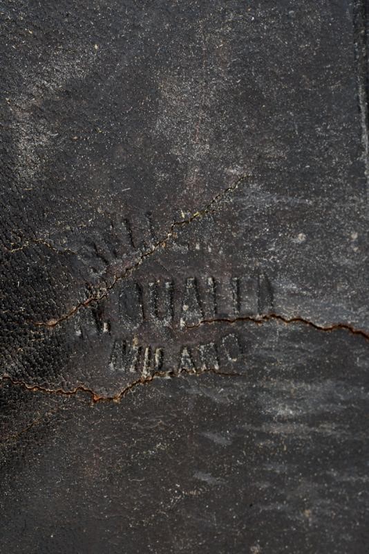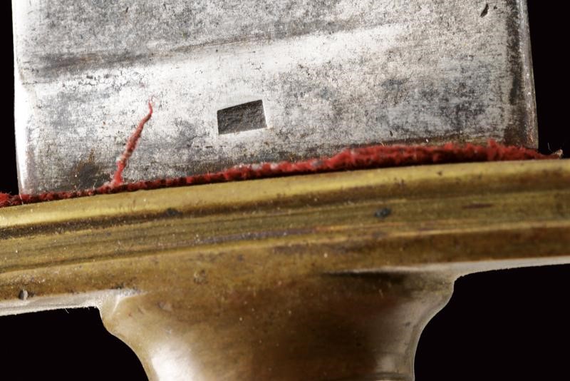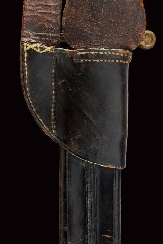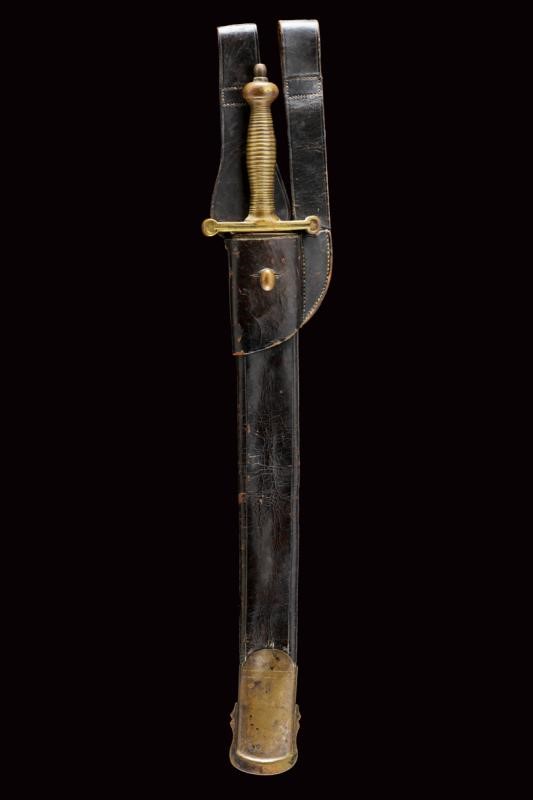 Wide, flat-sided, tipped and single-edged blade with saw back. Tang with remains of mark. Brass hilt, grip and pommel consisting of a single piece. Atypical button with brass nut and olive. Complete with equally rare leather scabbard with brass mounts. Leather belt frog marked "SELLERIA A GUALLA MILANO". See Calamandrei 'Armi Bianche Militari Italiane', pp. 42-43.