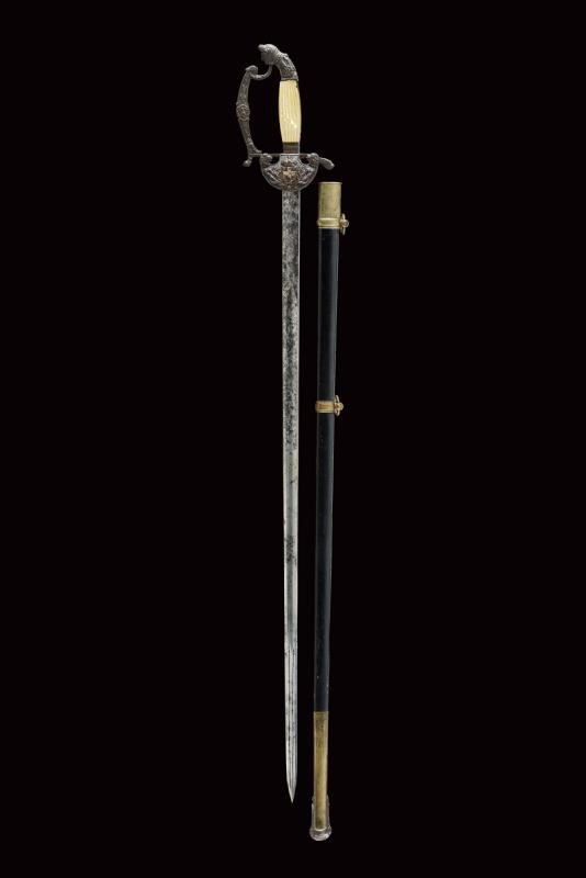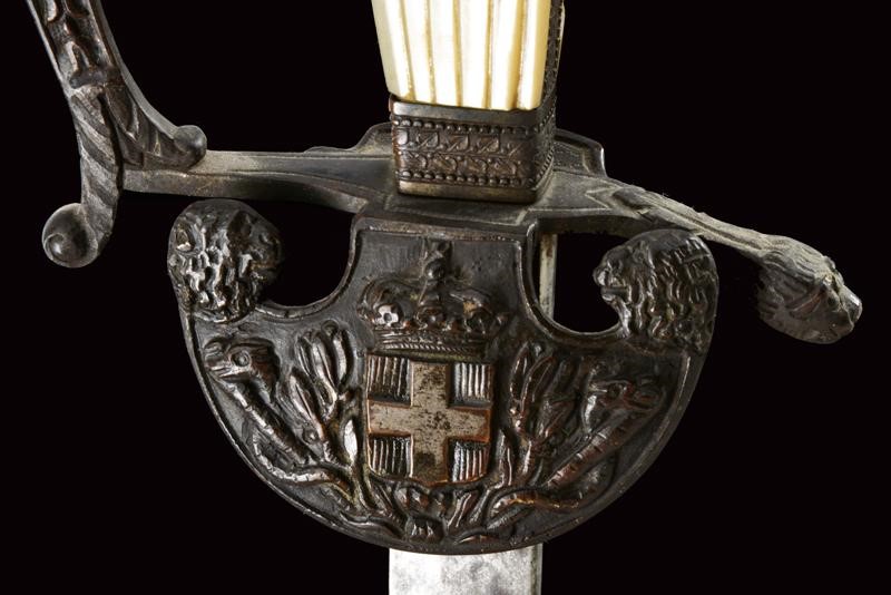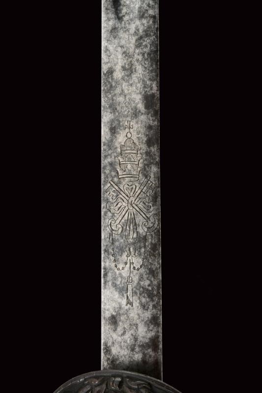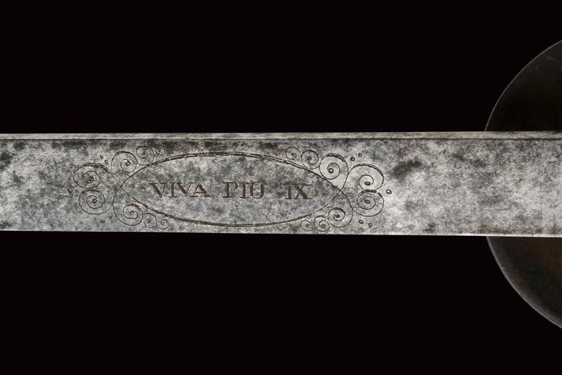 Straight, single-and-false-edged blade, flat at the first part engraved with tiara and keys on one side and with motto "VIVA PIO IX" on the other side. Silver hilt, shell-guard with Savoy coat of arms above two sticks with a snake, borders with lions' heads. Quillon and loop-guard with lion's head and floral decorations, pommel shaped as a head with laurel wreath. Grip with mother-of-pearl grips (a very small missing part). Iron scabbard with silver mounts. Two suspension rings. All in fine, dark patina.