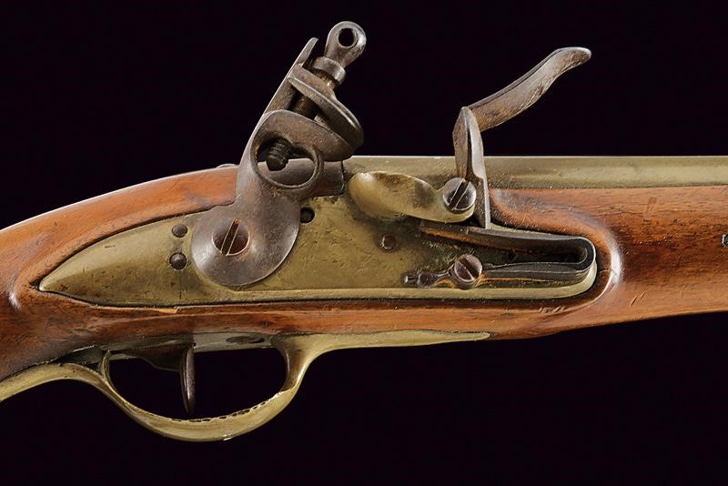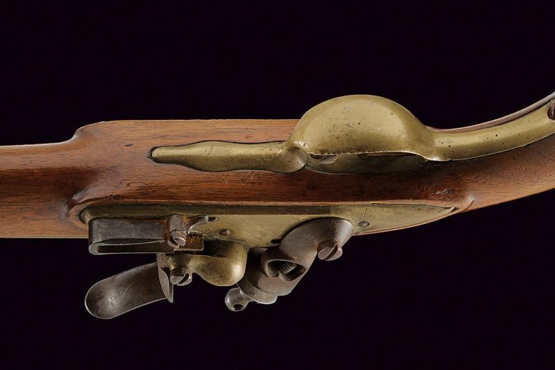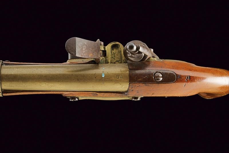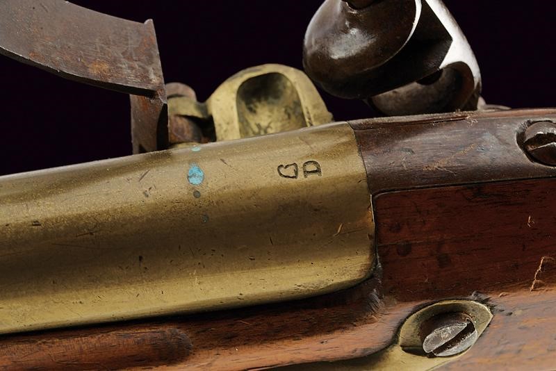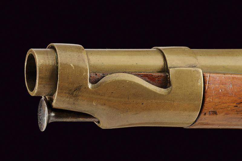 Smoothbore, round, made of bronze, 17,5 mm cal. barrel, marked at the base "D", under a mark with Phrygian cap; iron tang; brass lock with spring and iron cock. Wooden full stock with brass mounts and iron ramrod.