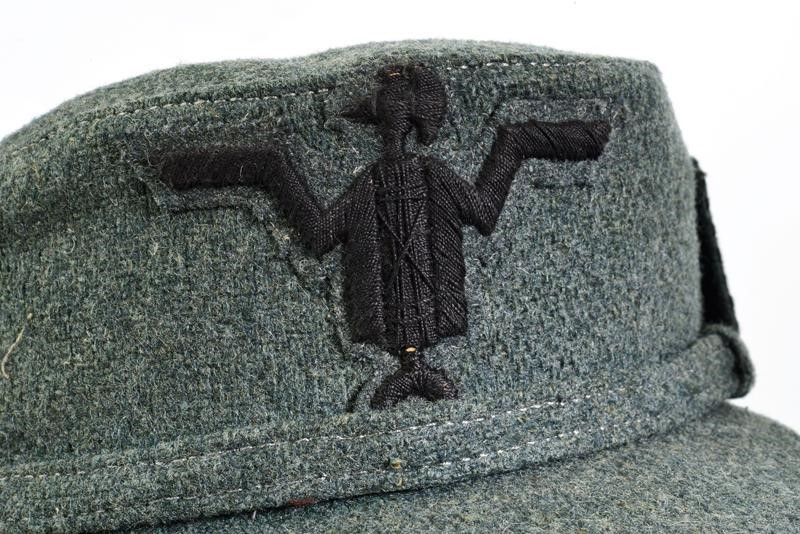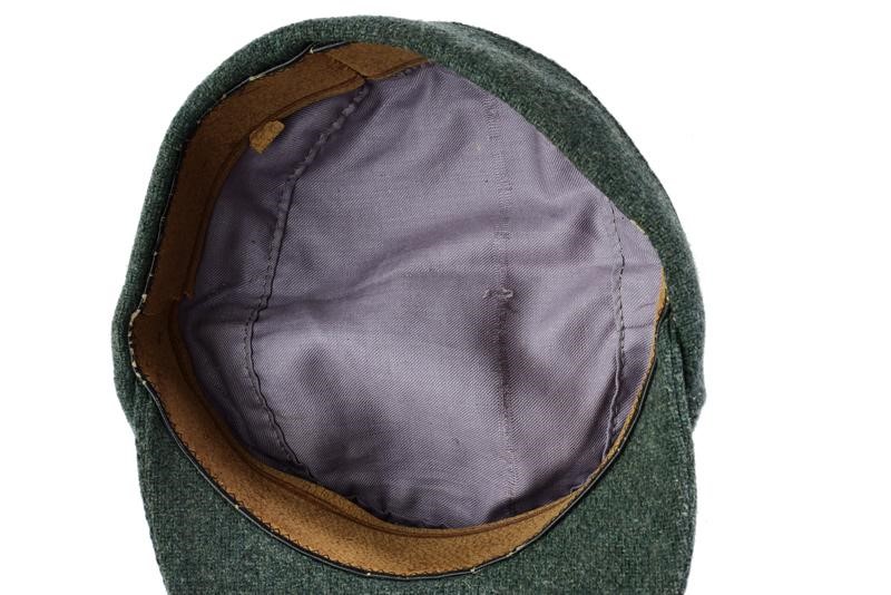Made of dark grey-green fabric, with a sewn frieze at the front. Lined.