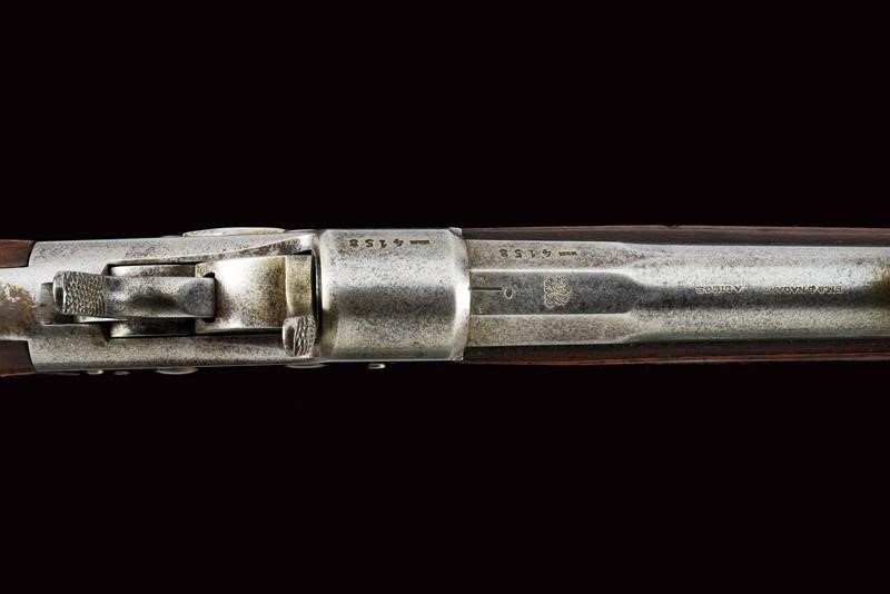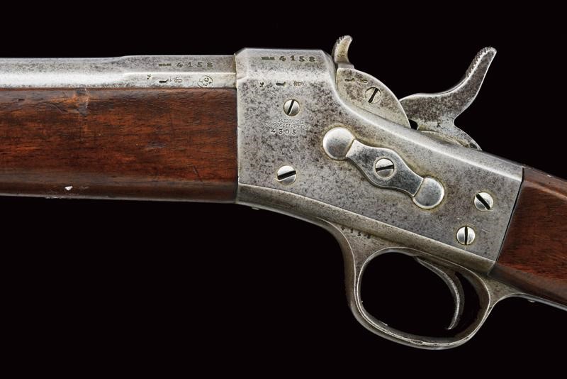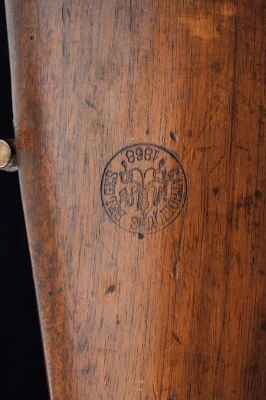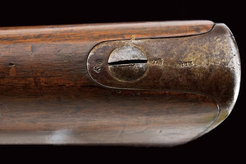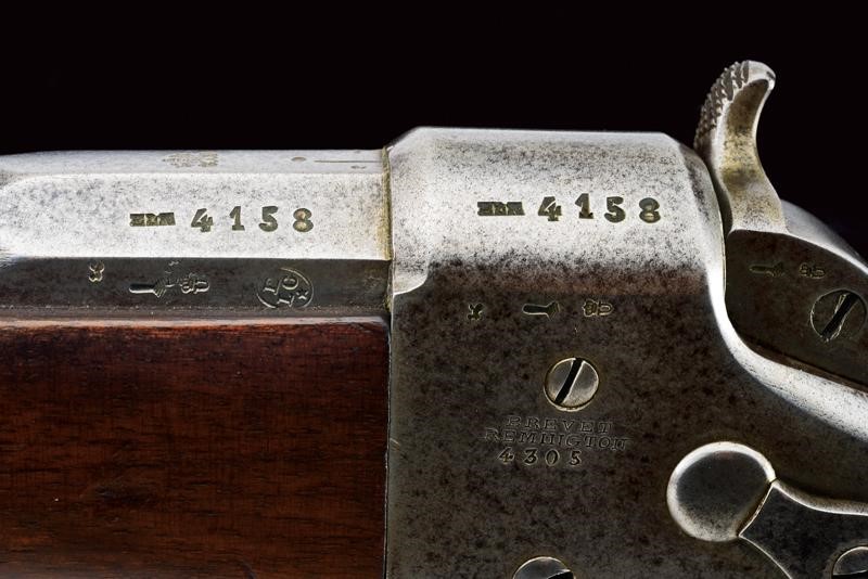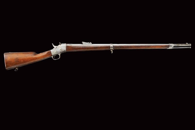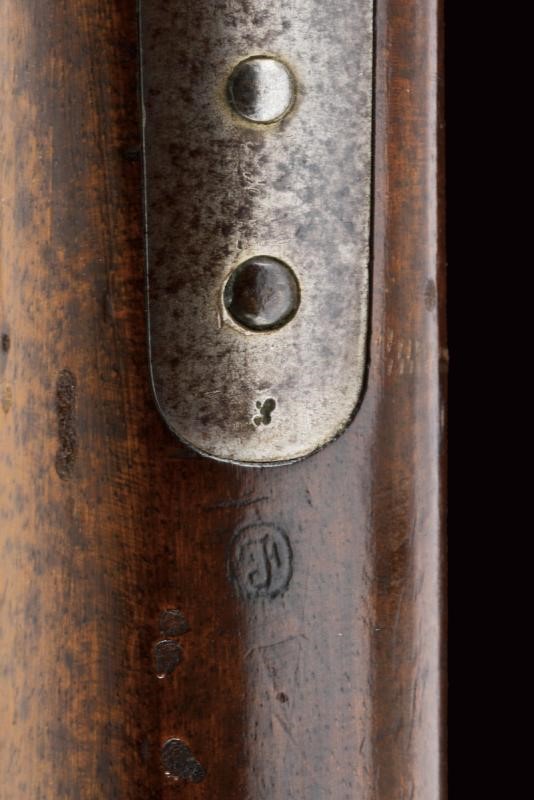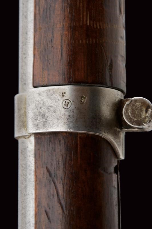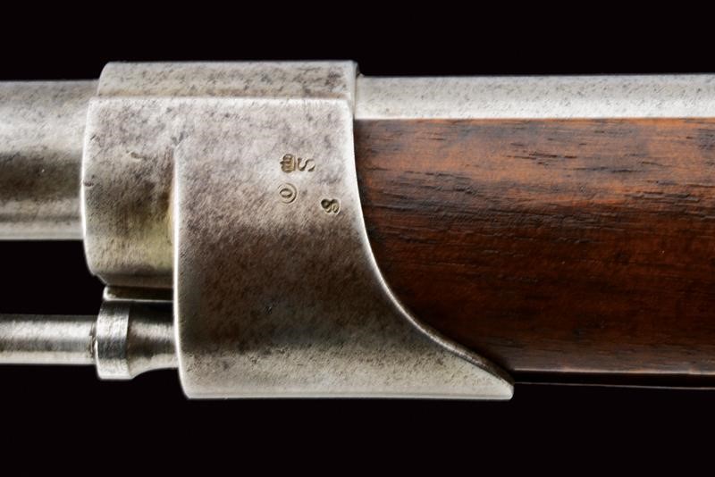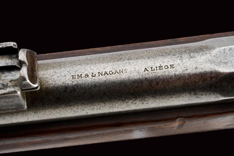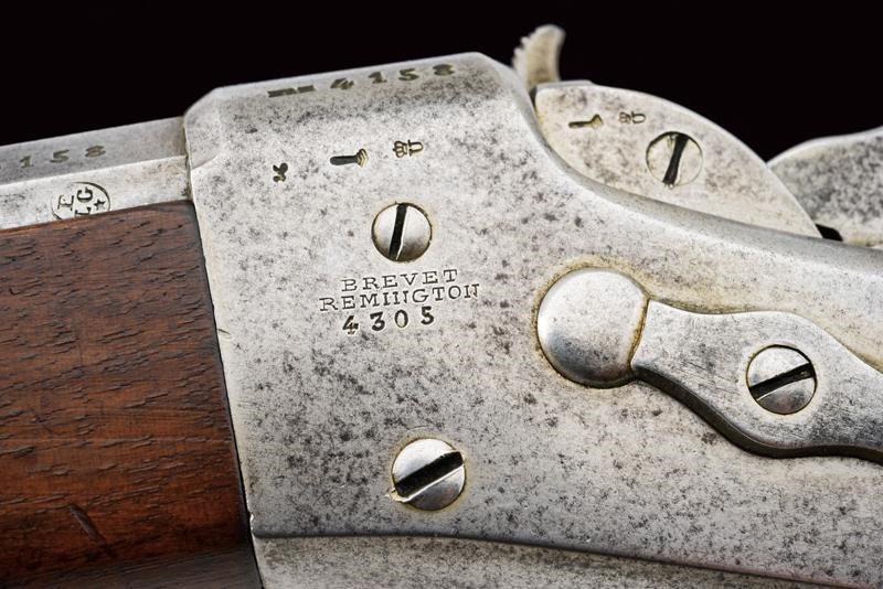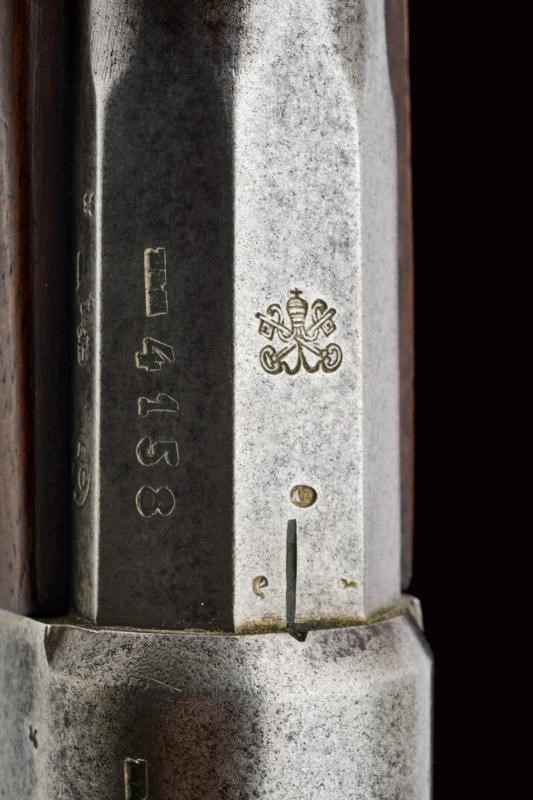 Round, rifled, 12 mm cal. barrel (slightly dusty bore with visible rifling), provided with foresight, club guide for the bayonet, foldaway and adjustable rear sight, featuring markings "EM & L NAGANT", Papal mark, other marks and the marks of the Liege test bench at the base, serial number "41xx". Frame with rolling-block bolt with mark of Nagant, coeval marks and serial numbers on the barrel and "BREVET REMINGTON 4305". Working mechanism. Wooden butt and fore-end, stamp "CATHOLIQUES BELGES" with date "1868" clearly visible on the right part of the butt stock. Iron mounts and ramrod.