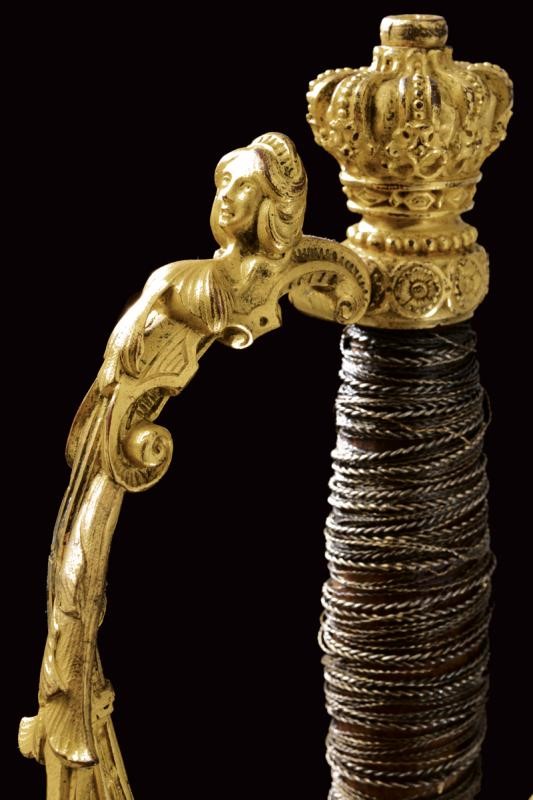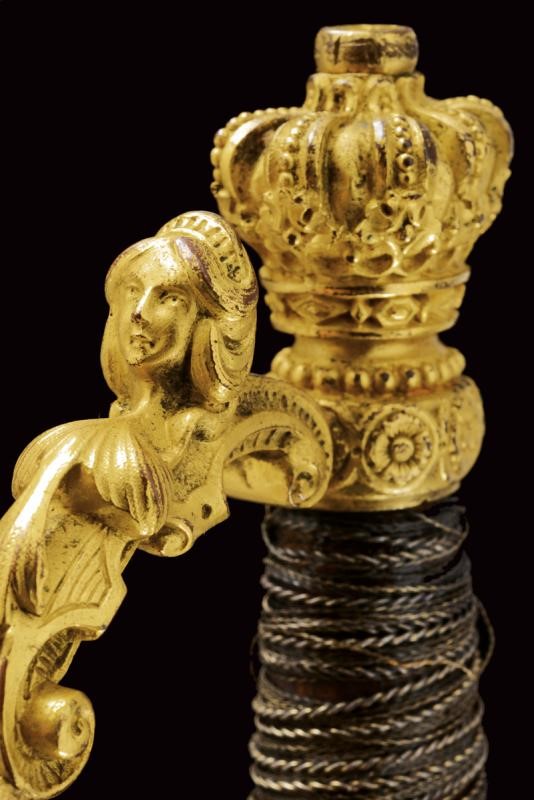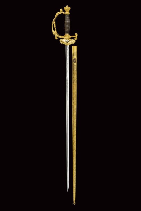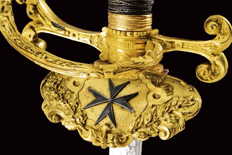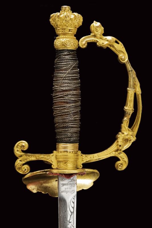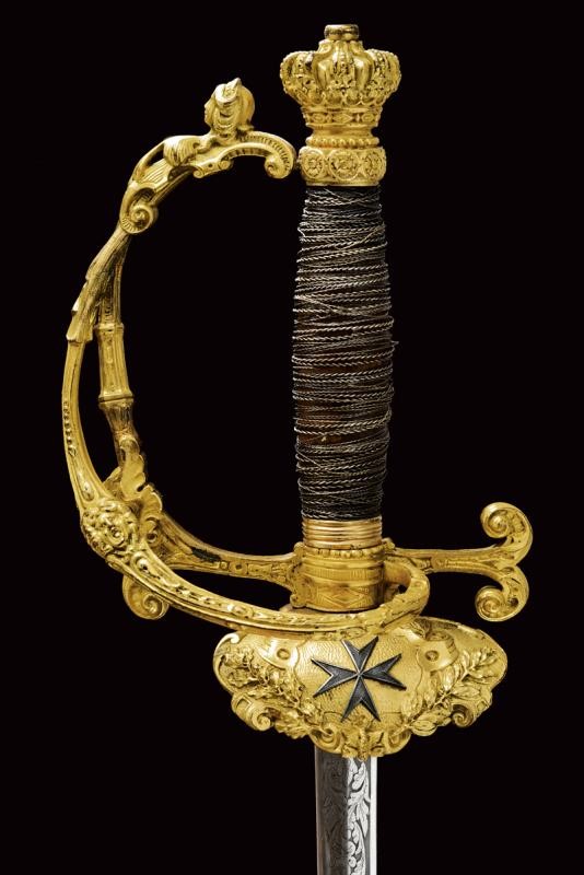 Straight, double-edged blade, the first part engraved with trophies and floral motifs on a granulated background, the tang signed "Coulaux & .ie Klingenthal France". Fine gilt brass hilt richly engraved in relief, the shell-guard with silver Maltese cross, two loop-guards, one with a human face, pommel shaped as a crown. Wooden grip with remains of metal wire binding. Brass scabbard engraved with floral motifs and a monogram "T". Suspension button with helmet and antique sword.