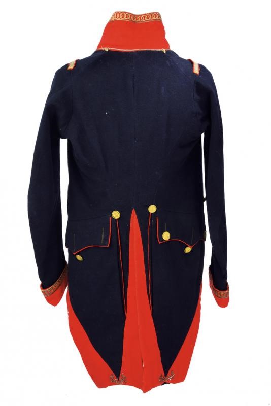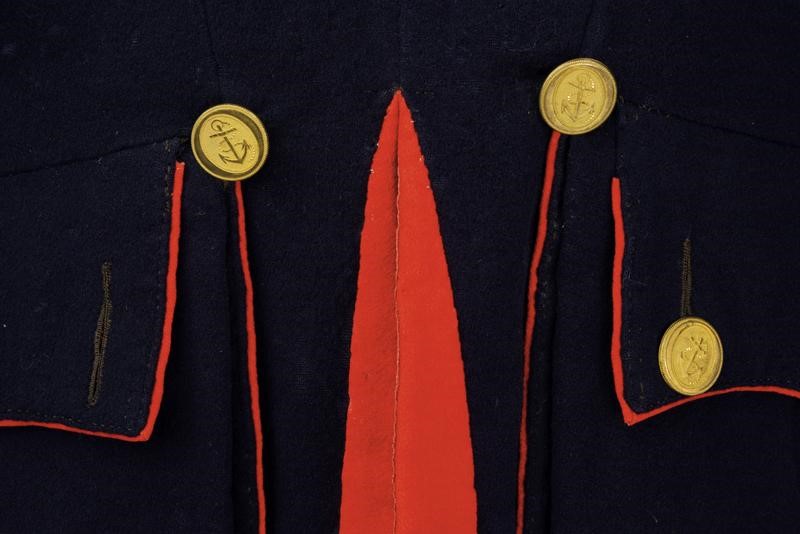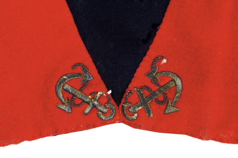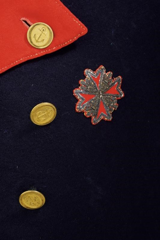 Made of black cloth with collar, sleeves and red bordering, collar and sleeves decorated at the borders with threads. Shoulders with loops. On the chest badge mark of the order sewn with threads on a red background. Gilt buttons with anchor in bas-relief. Red fabric inside. Small damaged parts. Rare.