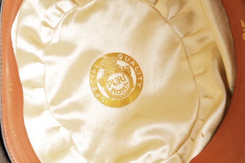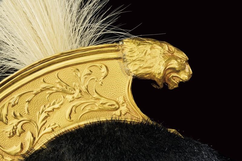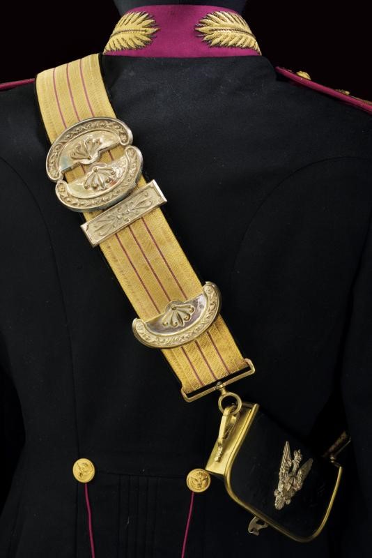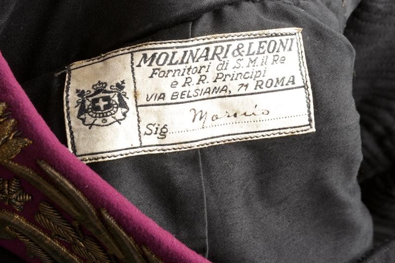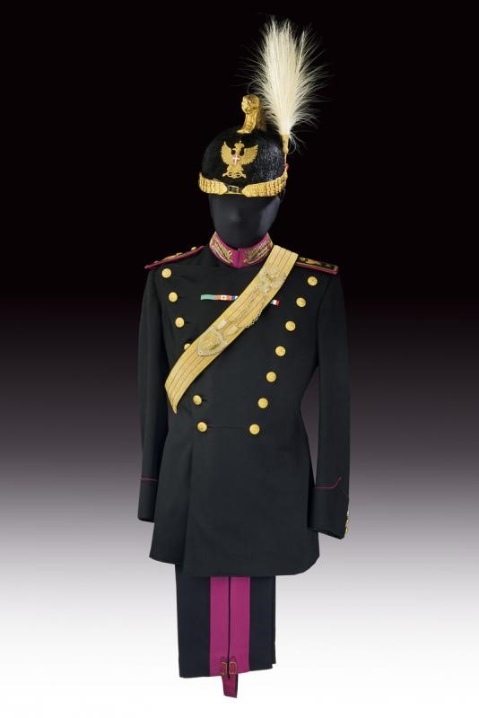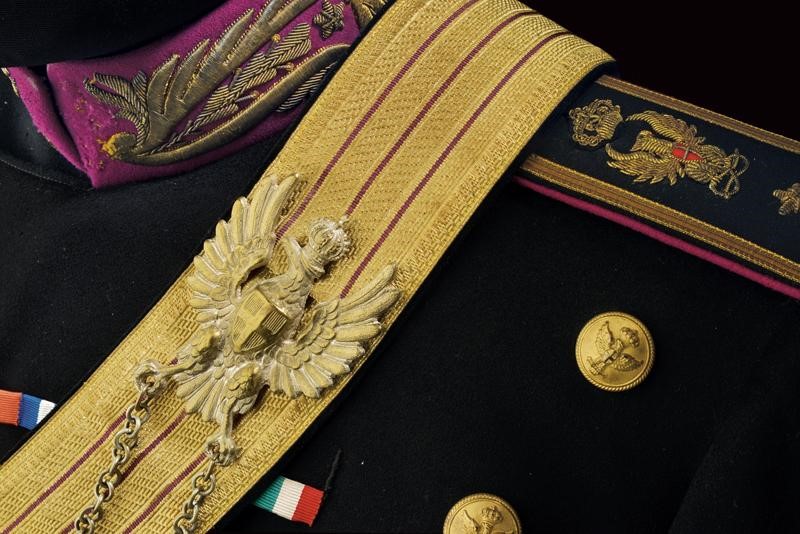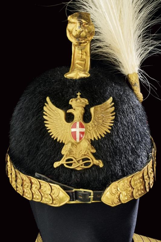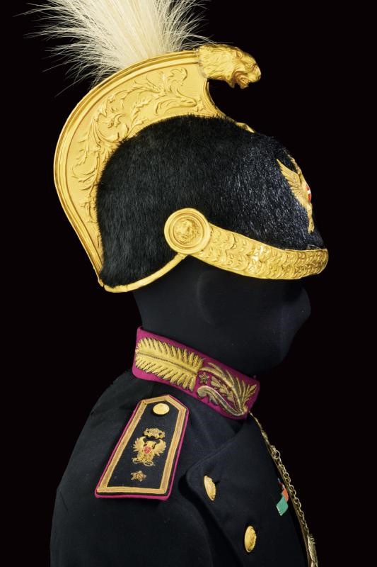 Beautiful helmet covered with black fur, a crowned Savoy eagle on the opposite side, red-and-white painted cross on a Savoy knot. Gilt-brass comb with lion's head and badge with fasces above a star. Complete with chin-strap, cockade and heron feather aigrette. Original, leather and white silk lining, both with the gold stamp of Ugo Puri, Rome. The jacket with all effects and Major's epaulettes, made of black fabric with collar (signs of use and time) richly embroidered with threads. Ribbons on the front part, label of the tailors Molinari and Leoni of Rome inside, with the owner's name 'Marini'. Complete with weathervane with cartridge box. Together with black trousers with burgundy cloth bands. An interesting Major's ensemble of the future police general Marini, only the division of Rome was provided with this rare helmet.