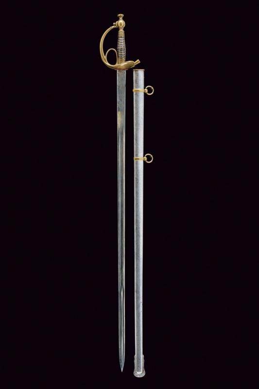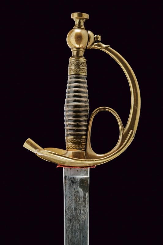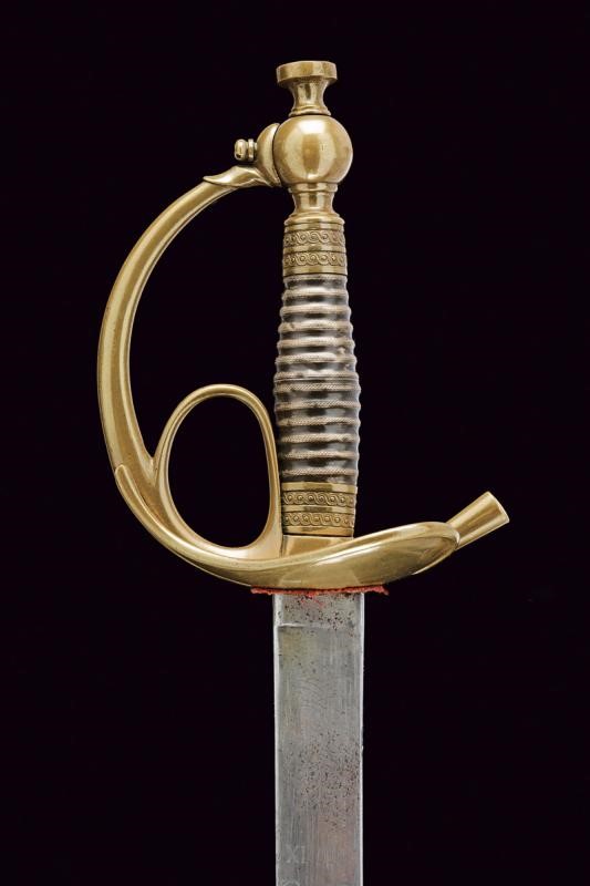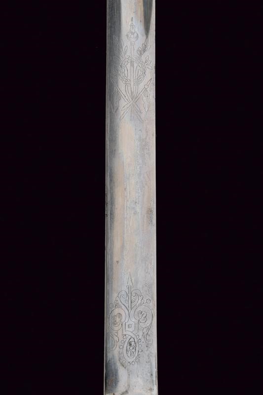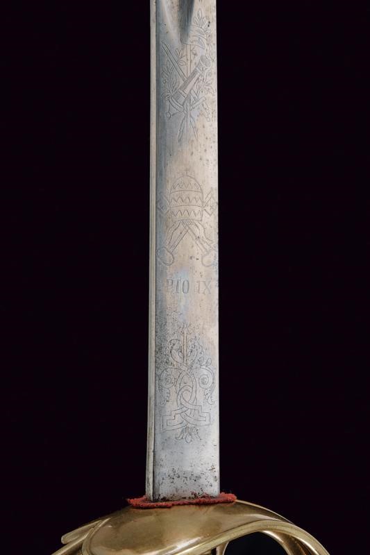 Straight, single-and short false-edged blade, with wide fuller doubling at the weak, at the forte decorated with the engraved inscription "PIO IX" and surmounted by the papal emblem, around trophies and spirals. Brass mounts, white metal grip. Iron scabbard (some pitting and small bumps) marked "GRAVIER A TURIN", with brass mounts. Two suspension rings.