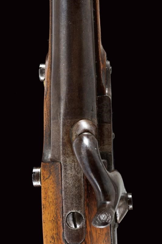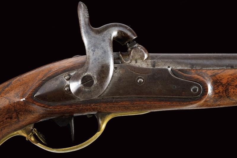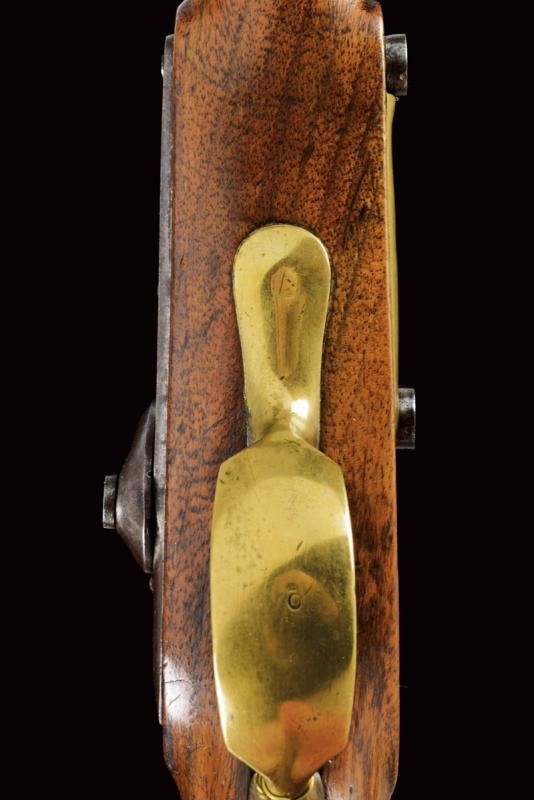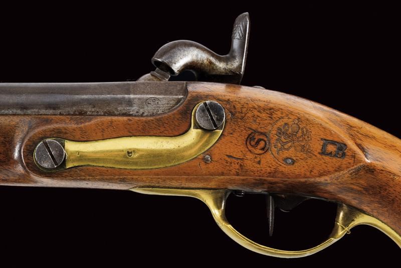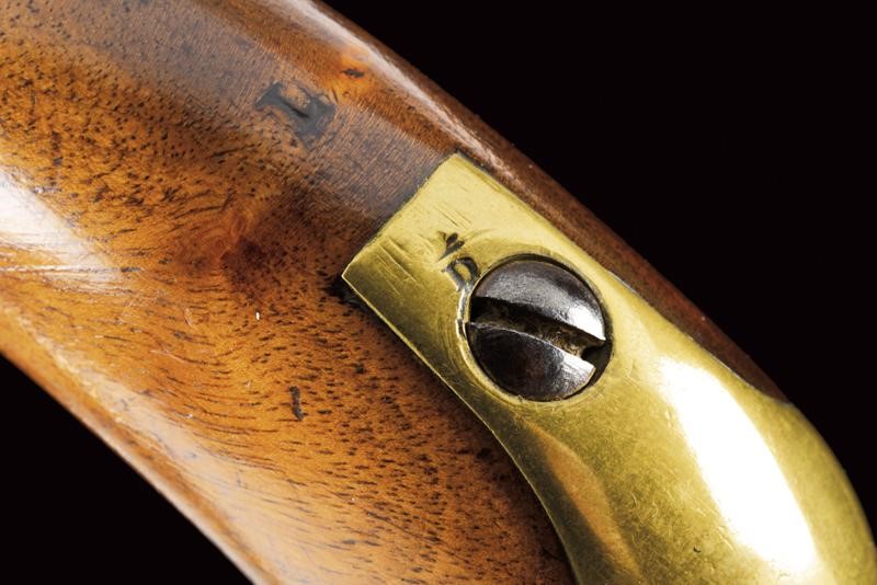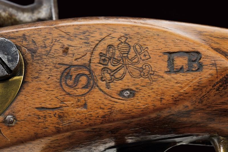 Smoothbore, round barrel, with brass foresight, octagonal breech bearing the mark of the Liège test bench, 17 mm. cal. at the nozzle. Lock converted to percussion, marked "O" under crown. Working mechanism. Long wooden stock stamped "S" and "LB" and with clearly visible Papal stamp. Brass mounts marked "D", trigger guard with "O" surmounted by crown. Iron ramrod.
