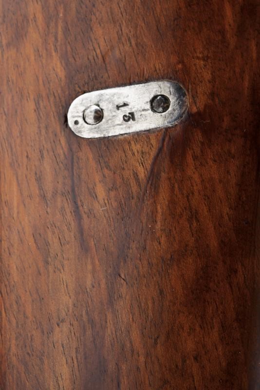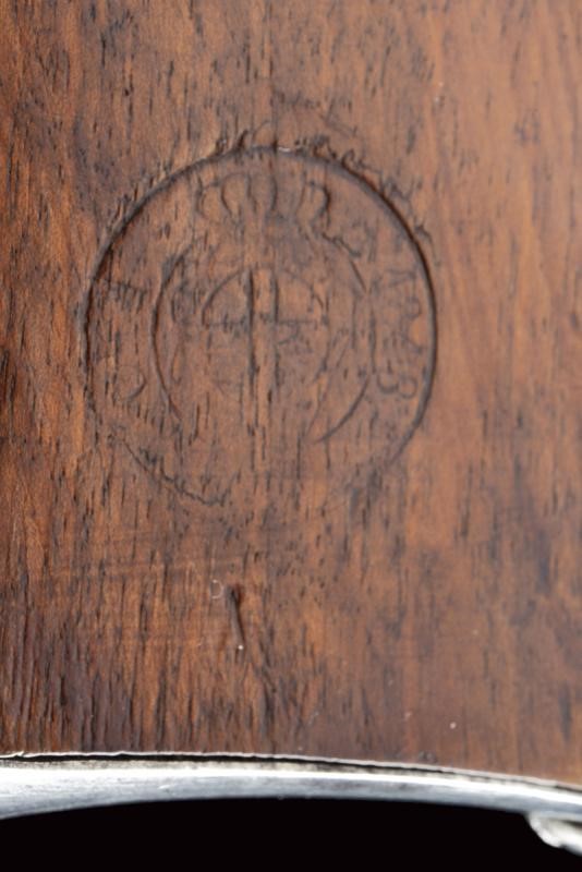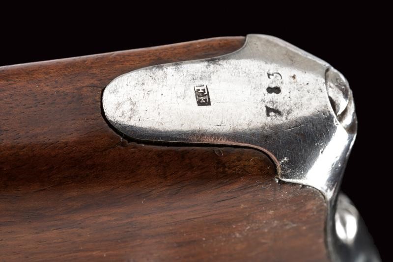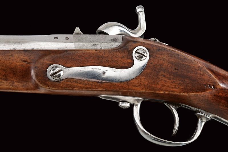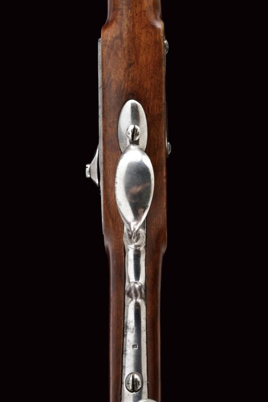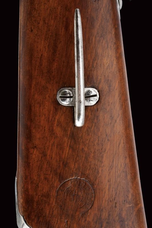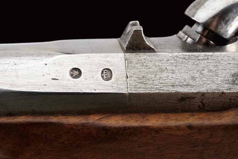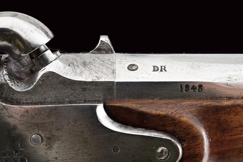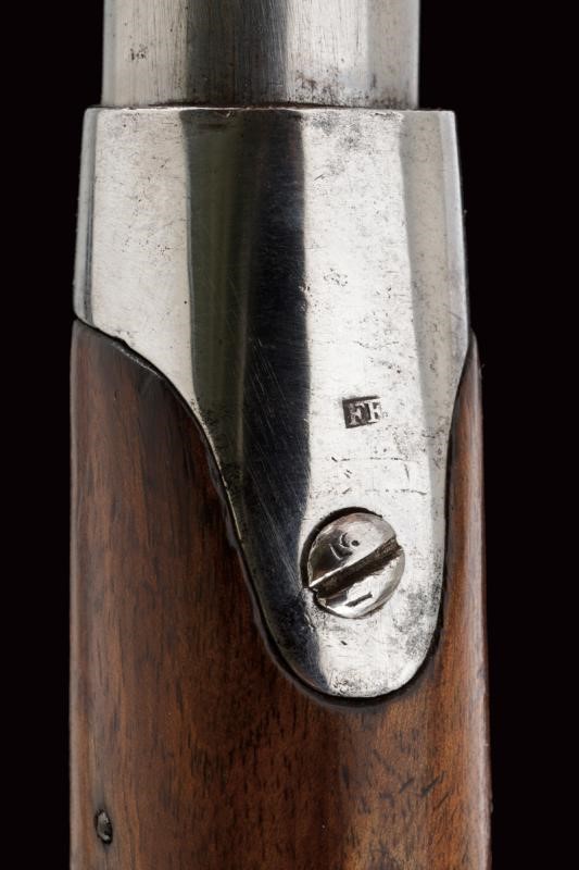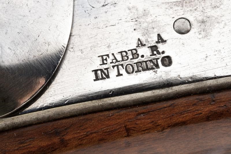 Round, rifled, 17 mm cal. barrel, with octagonal breech, foresight and sight, bearing several marks and dated "1848"; forward spring lock converted to percussion with flat lock plate, slightly rounded in the rear, marked "FABB.A R.A IN TORINO"; wooden half stock with Piedmontese stamp of 1848, iron mounts, (long) belt hook. Saddle ring. Rare.