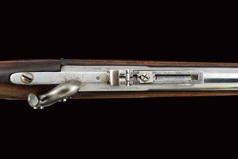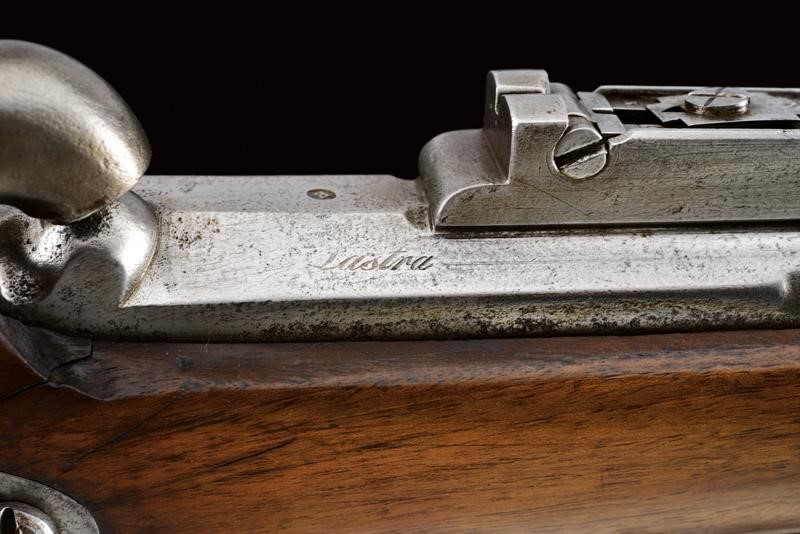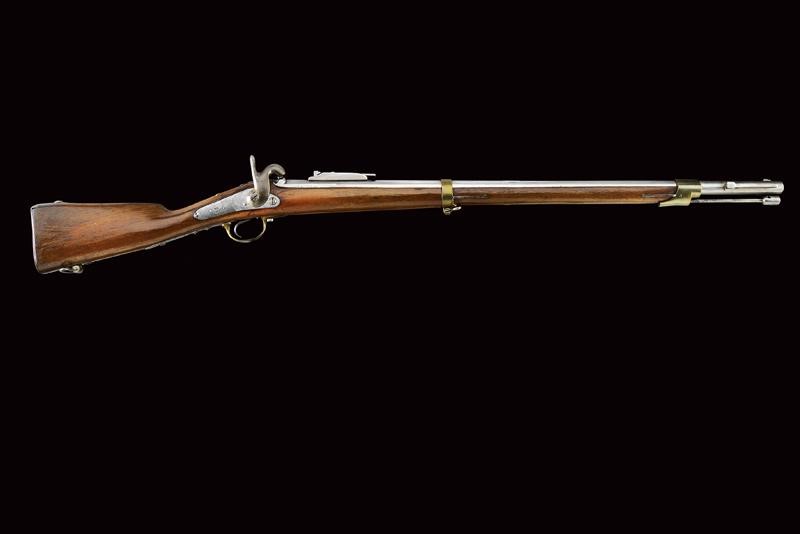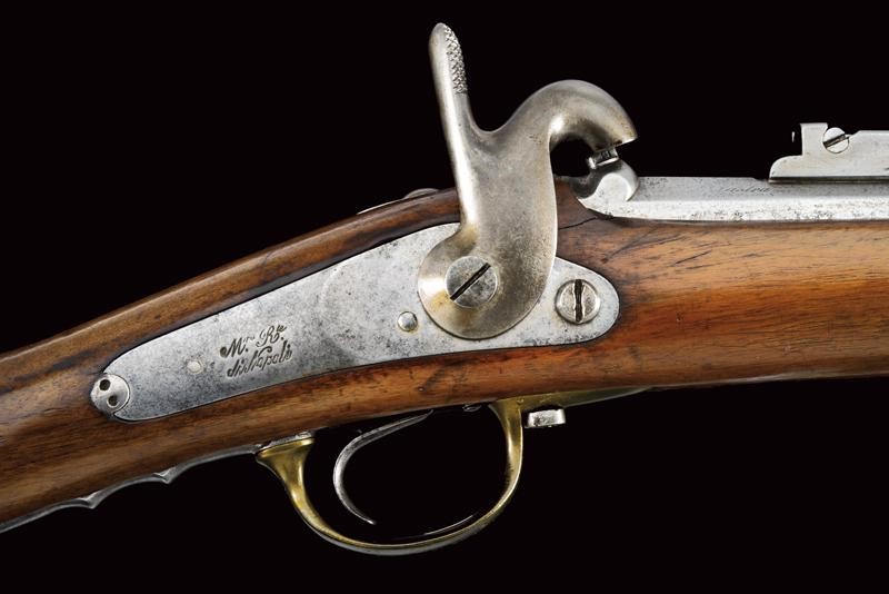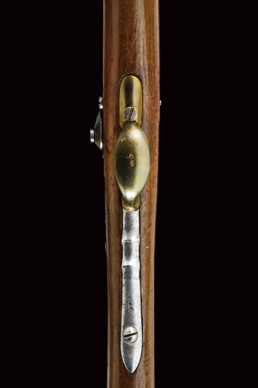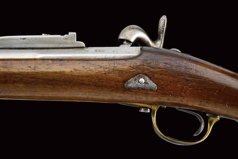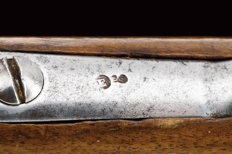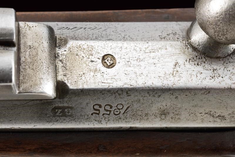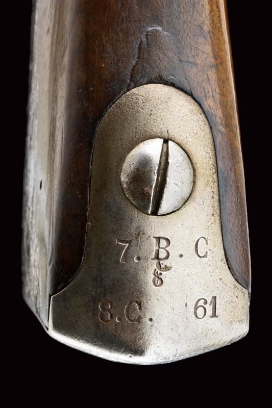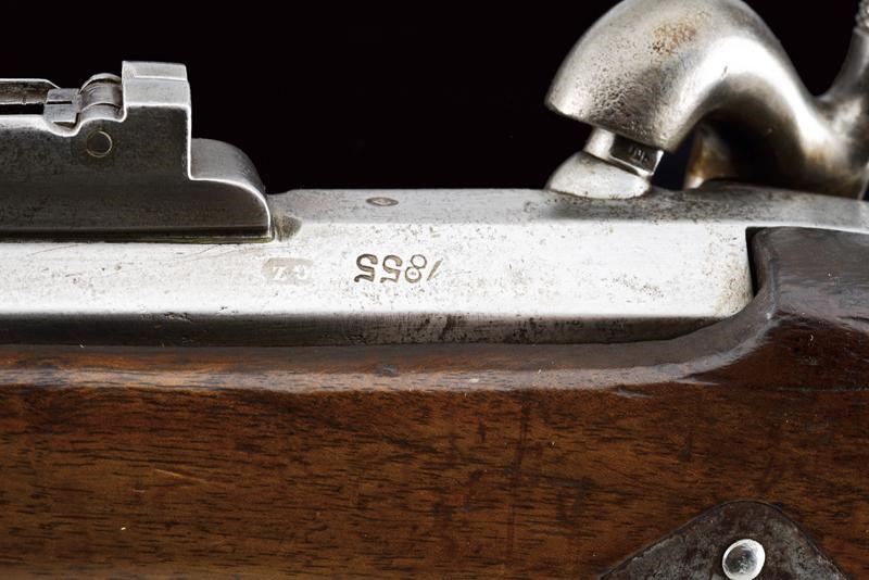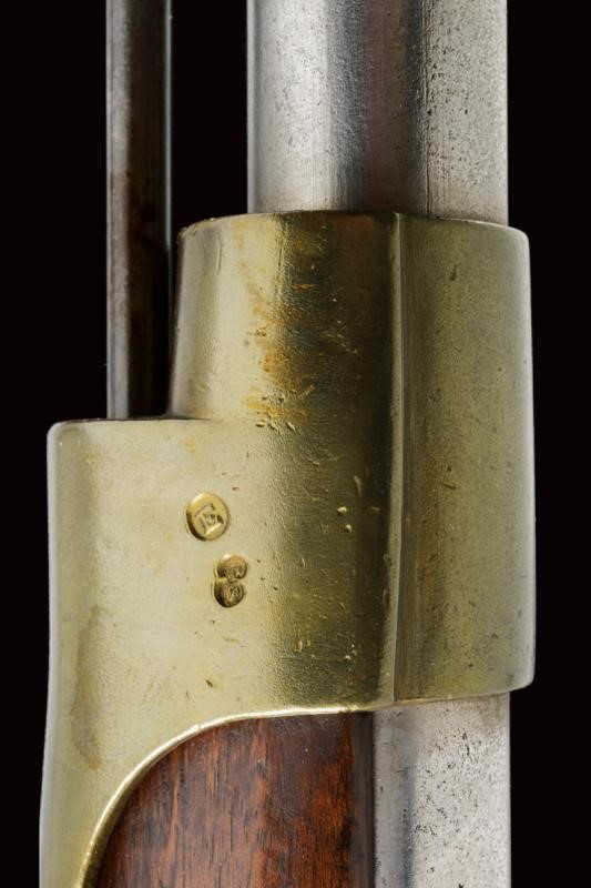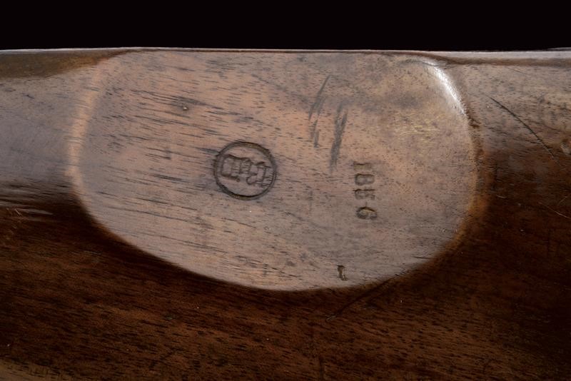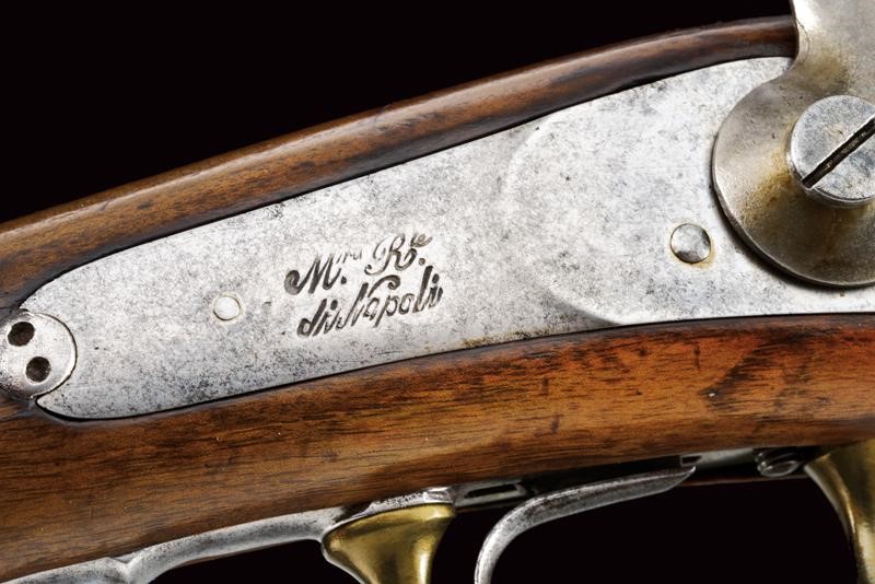 Rifled, round, 17 mm cal. barrel (bore with pitting, clearly visible rifling), with octagonal base dated "1855" and with marks "GZ" (Gaetano Zampognaro) and "E", adjustable and foldaway rear sight, front sight, club guide for the bayonet marked "38"; backward spring lock signed "M.ra R.le di Napoli"; wooden full stock marked on the butt with stamp and "1856". Brass mounts with various marks, butt plate marked "7.B.C.8.C.61". Iron ramrod marked "10.B. C. 3. C. 19".