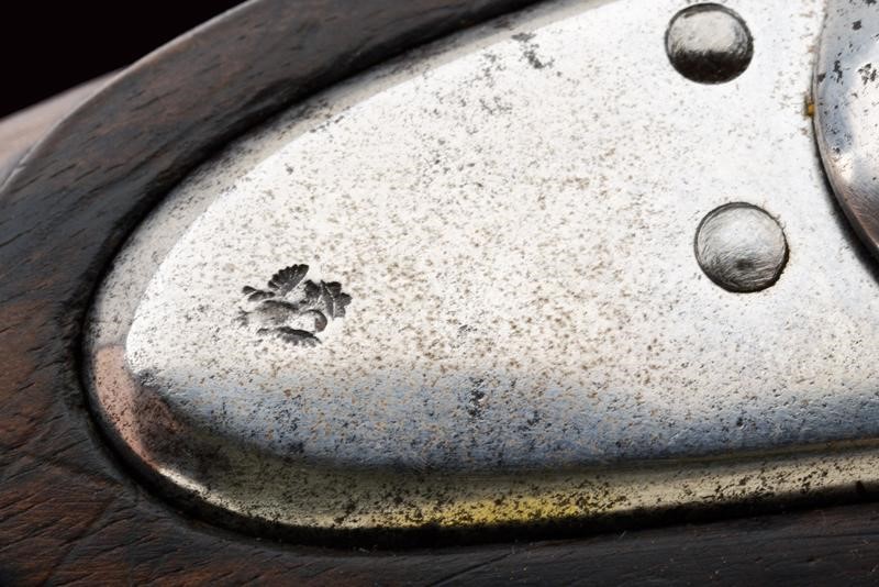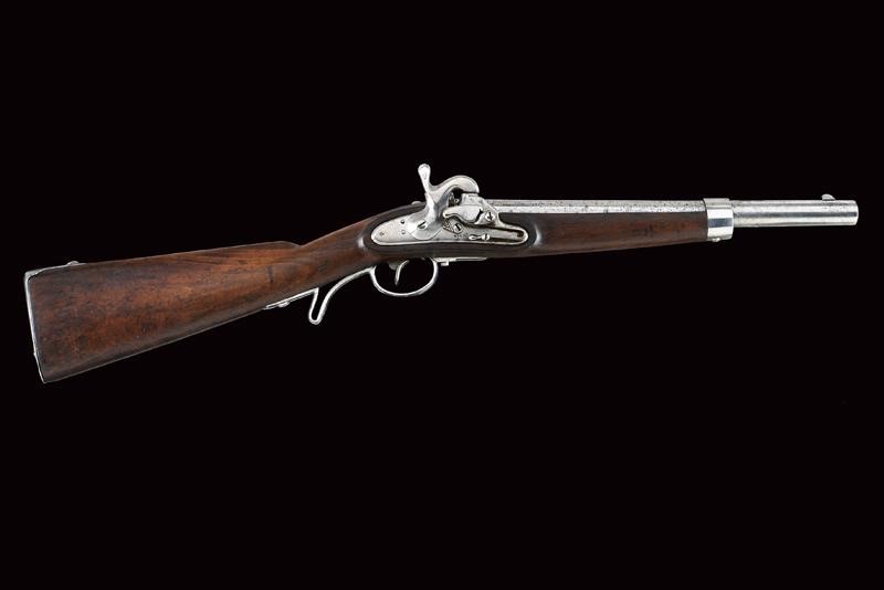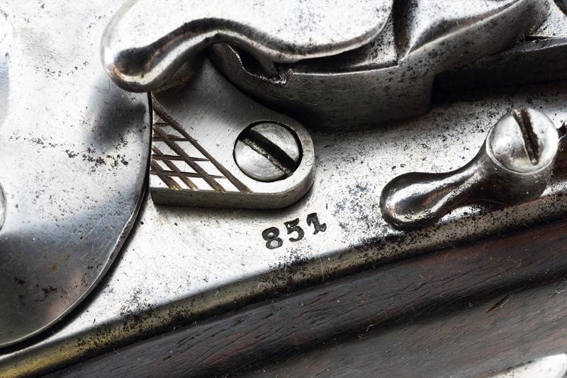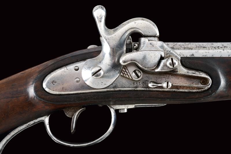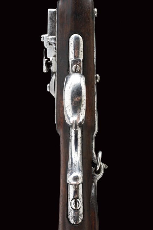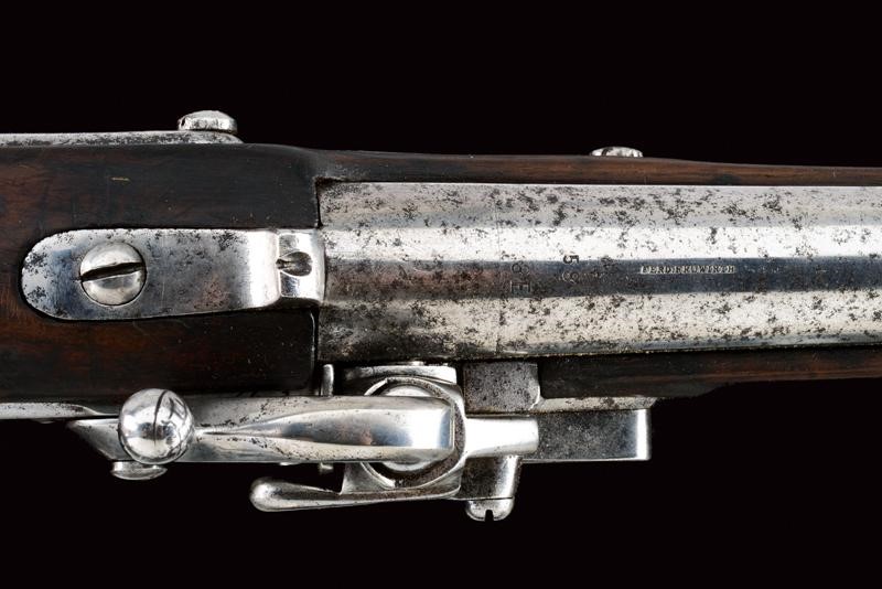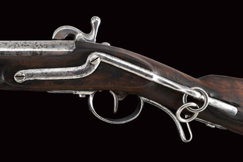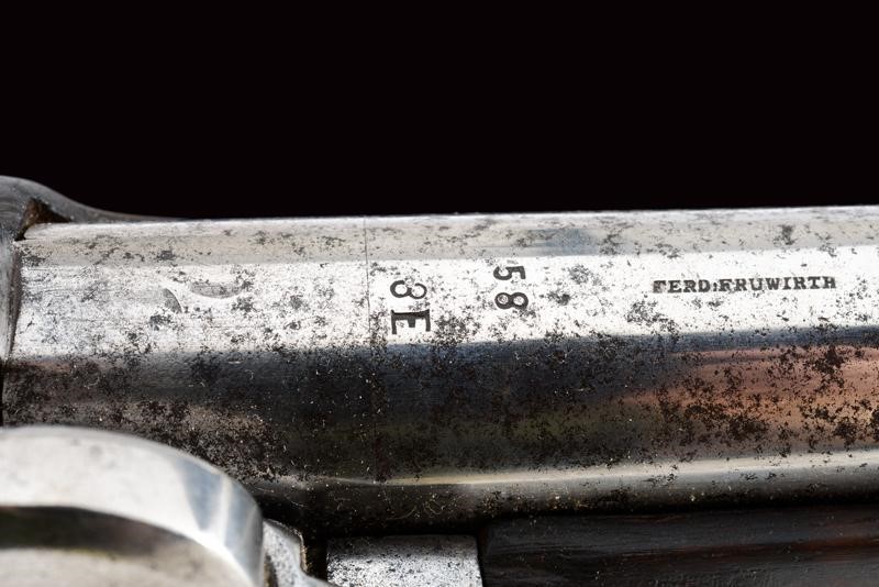 Smoothbore, round, 16,9 mm cal. barrel, marked "FERD. FRUWIRTH", "58" and "8E", foresight; lock with Augustin system, dated "851" and with imperial mark, with safety lock; wooden stock (signs of use) with iron mounts, the counterplate with saddle ring. Rare.