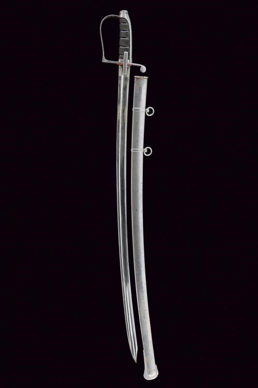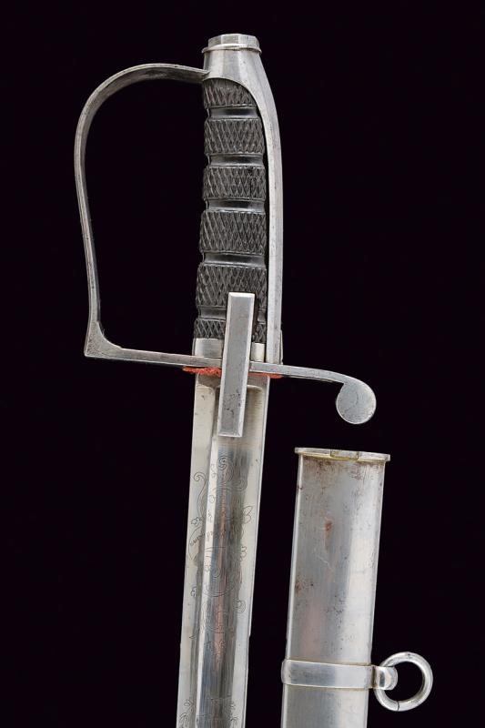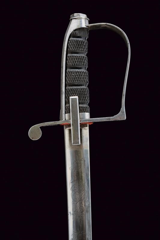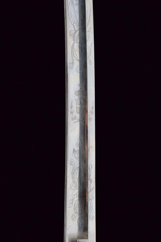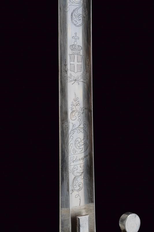 Curved, single-and short false-edged blade, with hollow tip at the back, with fuller doubling at the weak, well-preserved trophy and raceme engravings at the forte, Savoy coat of arms used under Victor Emmanuel II; signed "J.E. Bleckmann / Solingen". Iron hilt with stirrup guard, long cap. Checkered, ebony grip. Iron scabbard with two lugs. Small signs of use on the hilt and the scabbard, very well preserved blade.