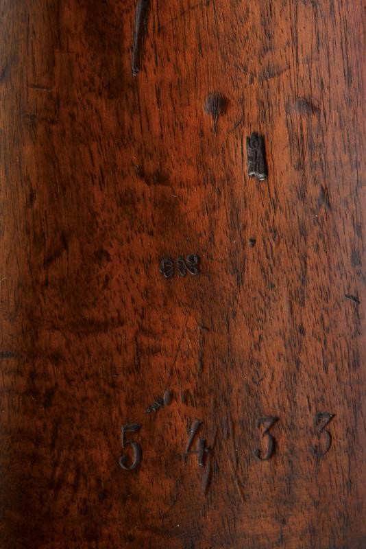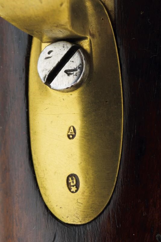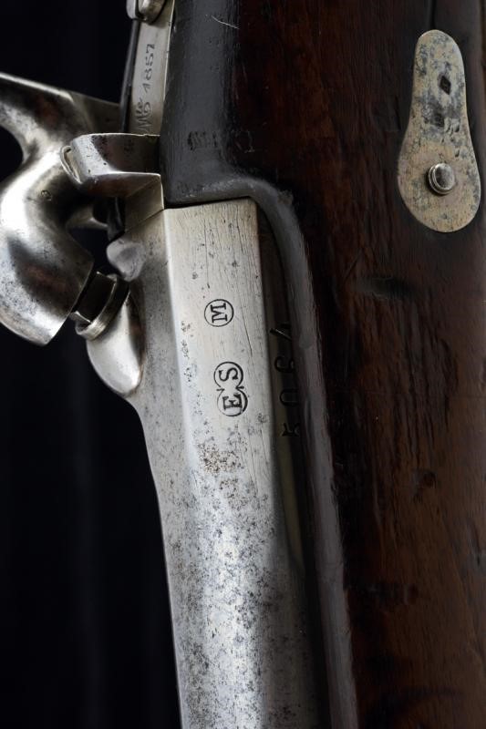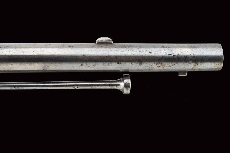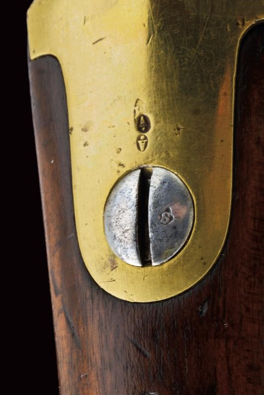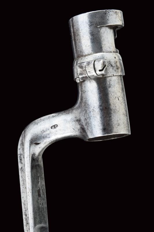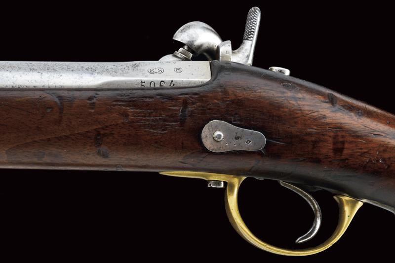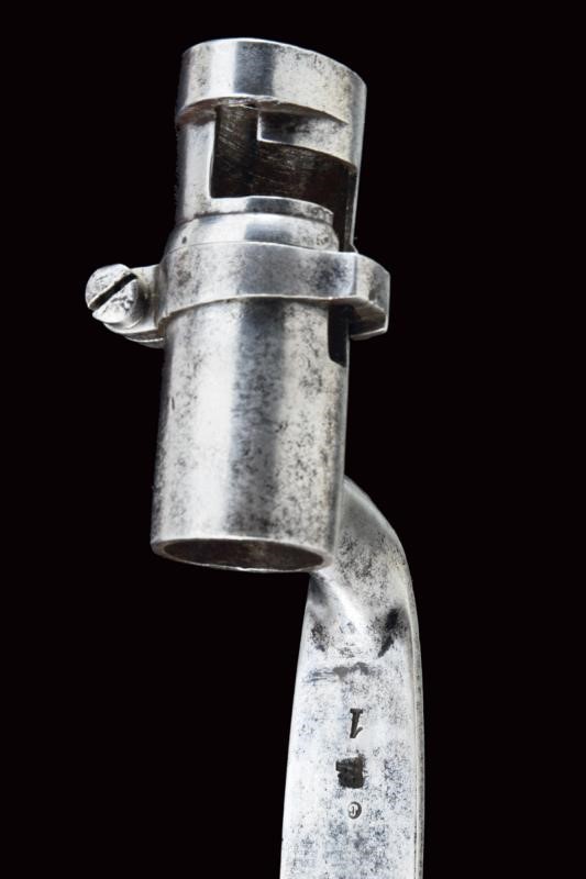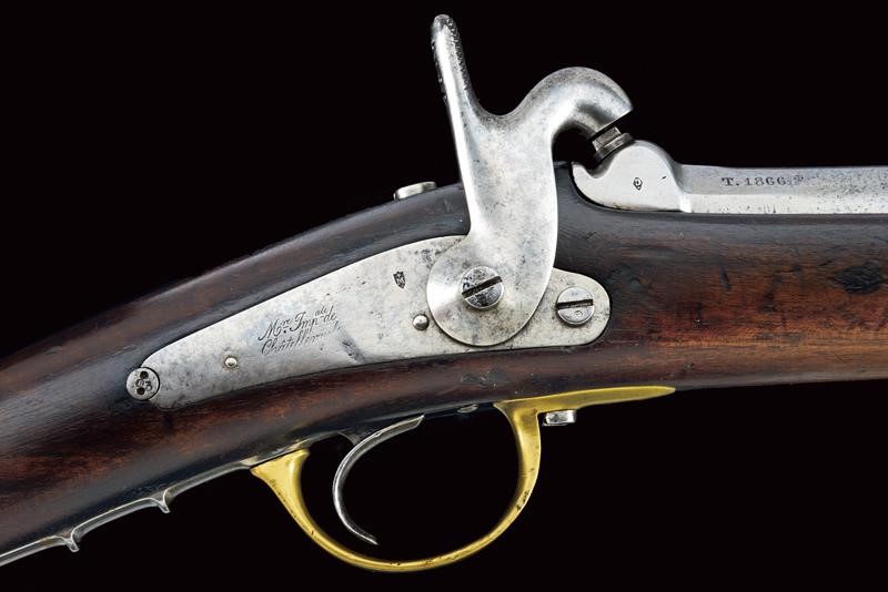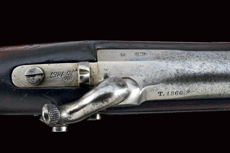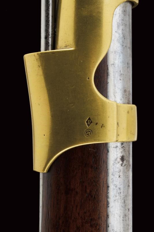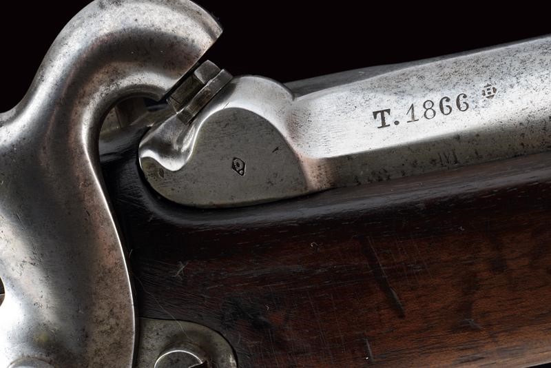 Round, rifled barrel with octagonal breech (some signs of use inside, bore mostly clean, clearly visible rifling), featuring various marks such as the typical papal numbers at the base, "E S" and "M" in circles, "T.1866" and "H" in a rhombus, provided with clutch for the bayonet and foresight. Tang with fixed rear sight and model inscription. Backward spring lock marked "M.re Imp.le de Chatellerault" and marked "M" under star and in a shield. Working mechanism. Three-quarter wooden stock with stamp on the right side of the butt stock which is not clearly visible but has well stamped marks on the left side such as the numbering (different from the barrel) and other crowned stamps, a few sins of use. Brass mounts with strongly visible marks. Butt-plate with marked screw and dot. Iron ramrod. Marked socket bayonet, length: 52.8 cm Probably purchased by the Papal States to equip their troops.