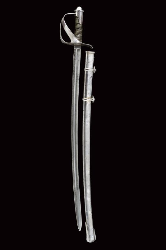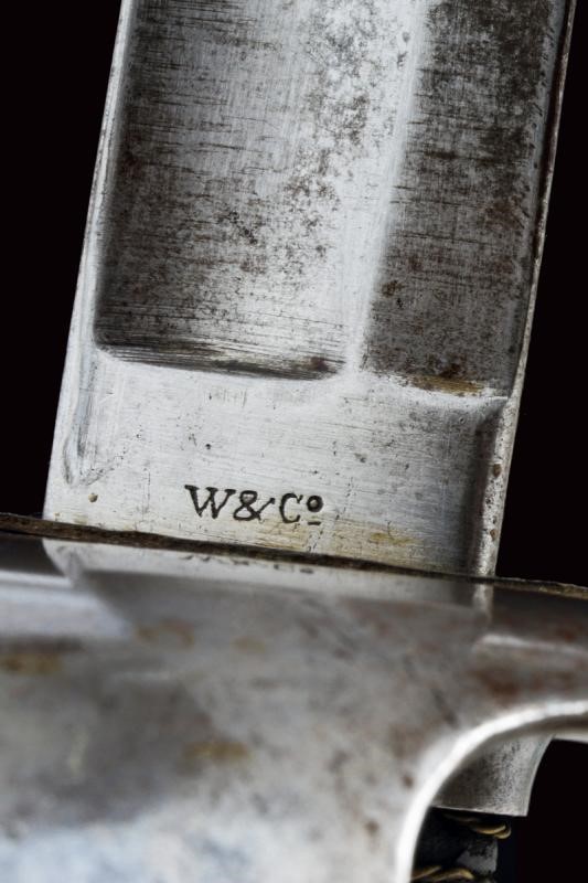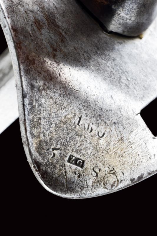 Wide, well-preserved, curved, tipped, single-and short false-edged blade, with fuller, at the tang marked "W&Co." on one side. Iron hilt with slot shaped as a drop and with openings for the sword knot, marked "ZG" with remains of numbering "160". Short smooth iron cap. Grip with old leather covering and brass wire binding. Iron scabbard (a couple of light bumps) with two lugs.