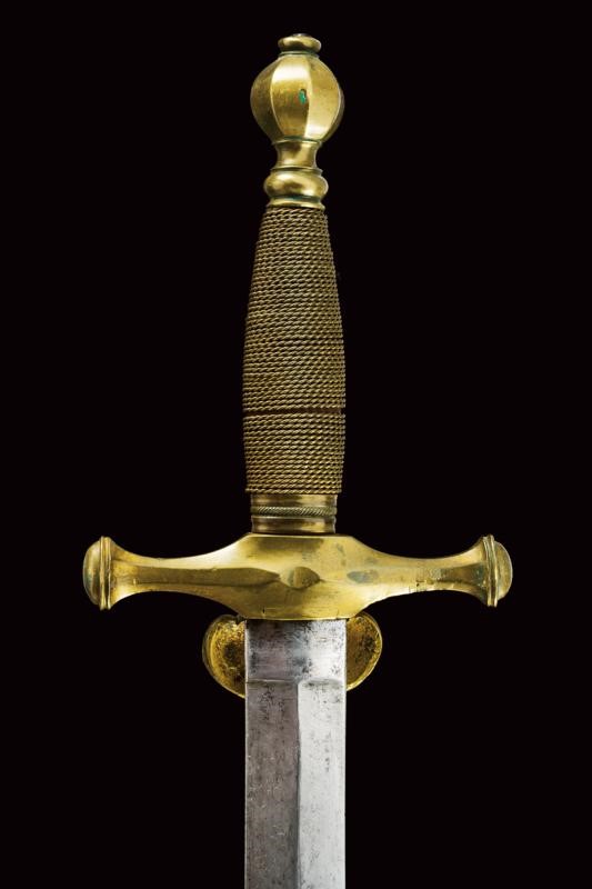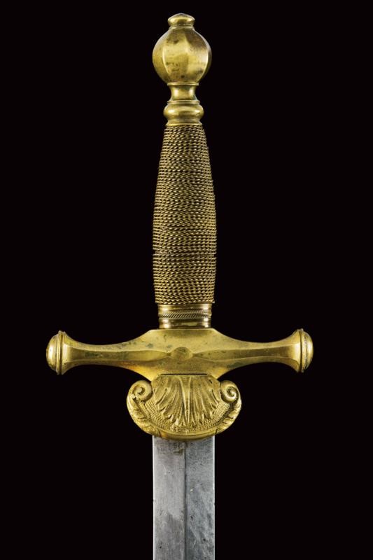 Straight, double-edged blade, ribbed at the centre, with short tang; brass hilt with remains of gilding, shell-guard with palmette decoration in relief; quillon with straight quillons, faceted pommel, grip covered with brass wire binding. Iron scabbard with button.