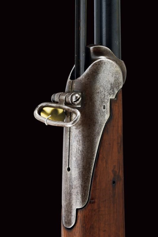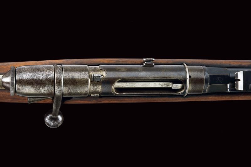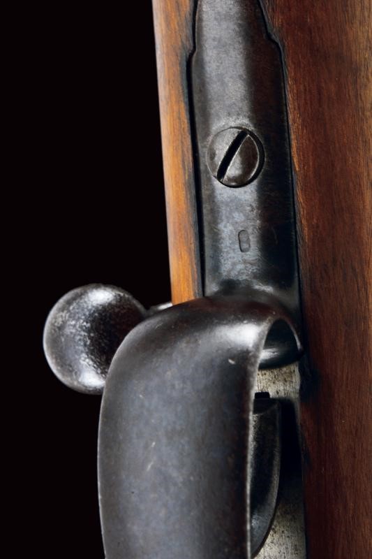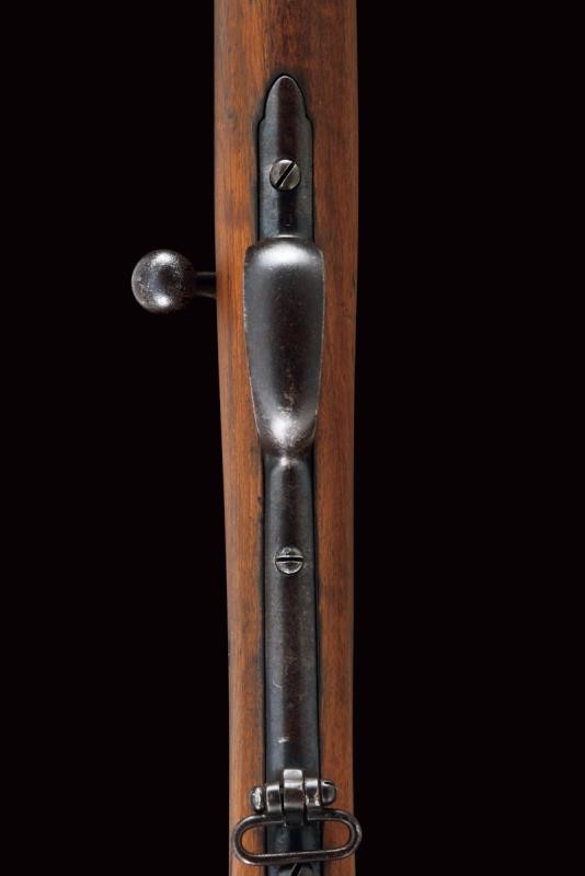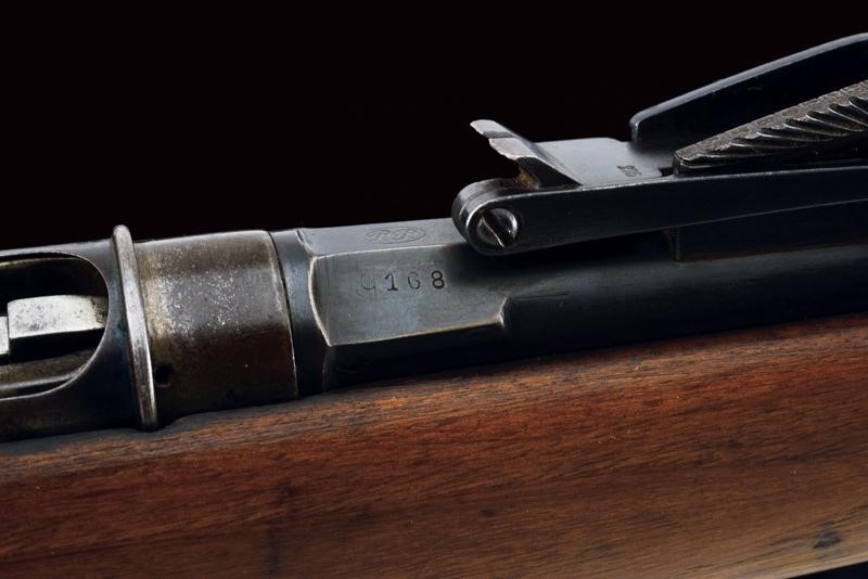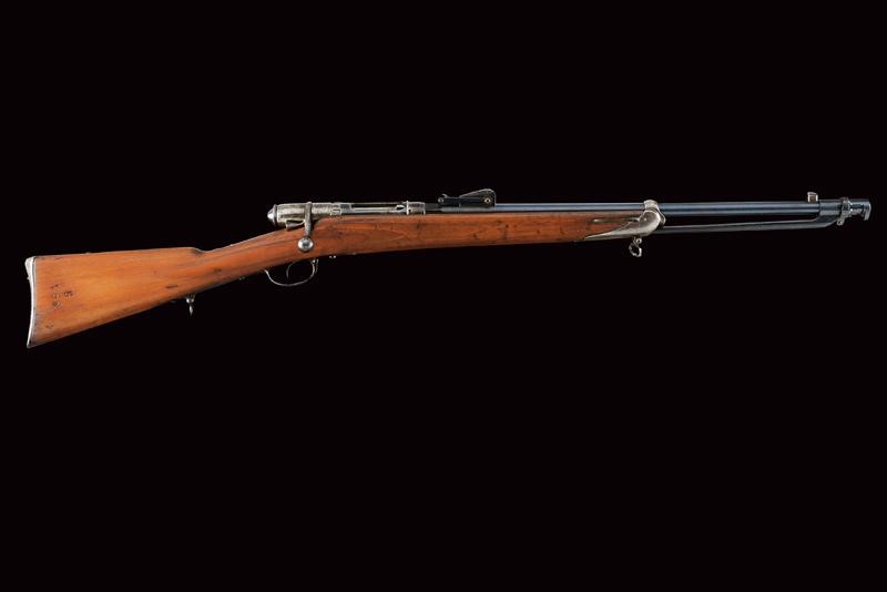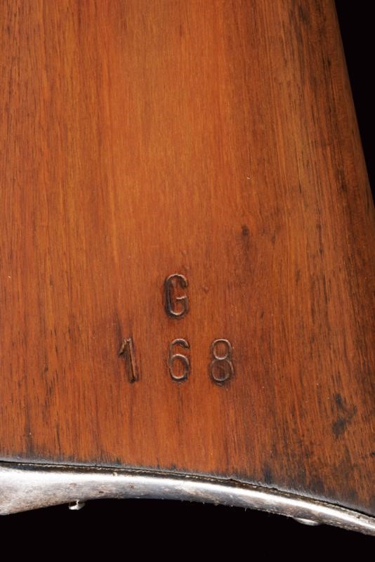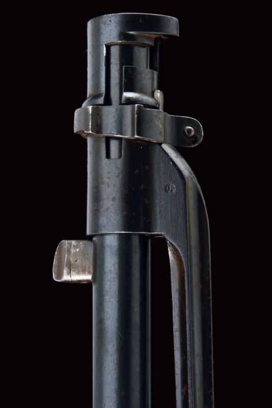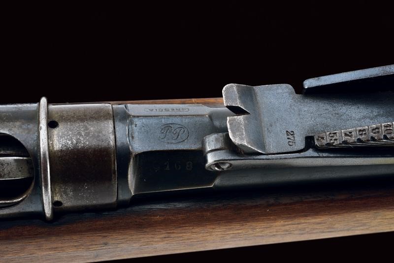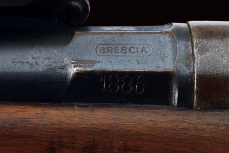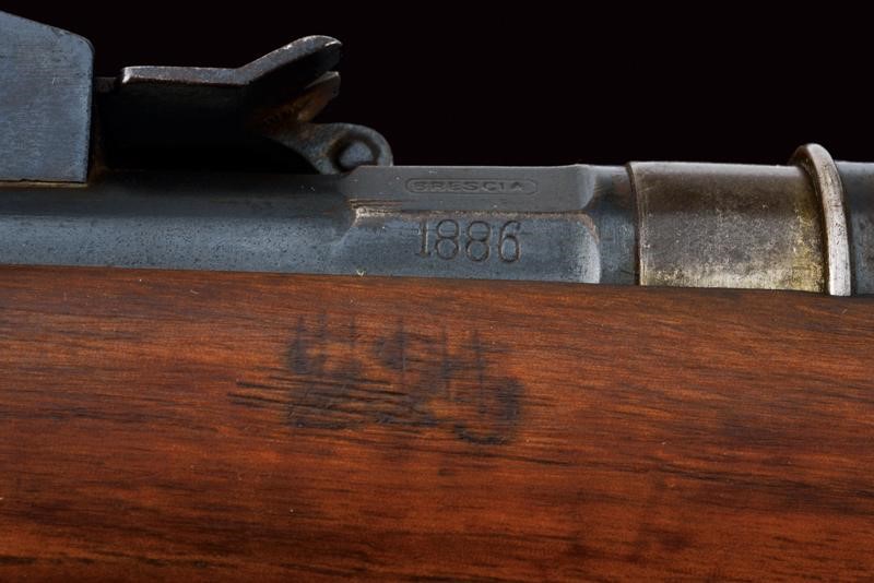 Round, rifled barrel (clean bore, visible rifling, some pitting at the nozzle), provided with front sight and adjustable rear sight, marked "BRESCIA", "PP", with date "1886" and serial number "G1xx", with mark "DA" and the Savoy shield on the right side, 10.4 mm cal at the nozzle. Sliding-revolving bolt with cover, working mechanism. Half wooden stock with coeval serial number. Iron mounts. Some pitting. Remains of antique browning. Complete with socket bayonet with different serial number.