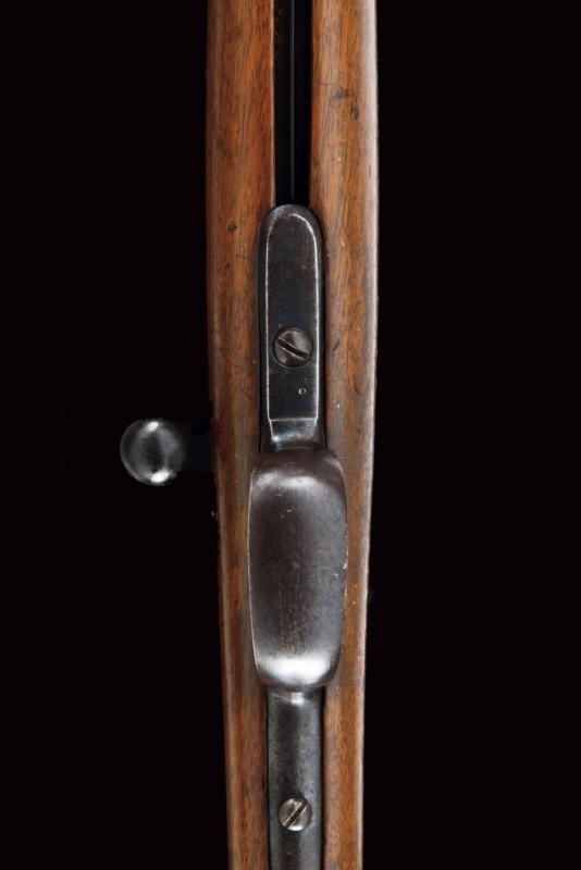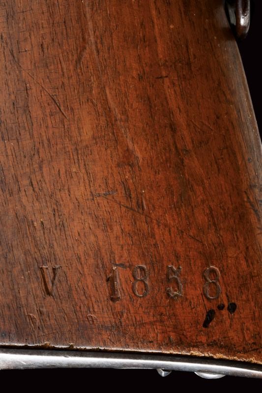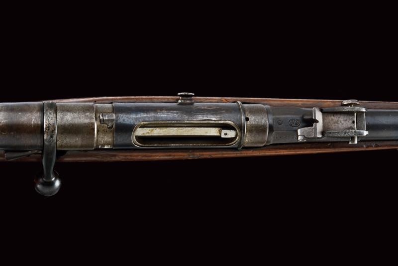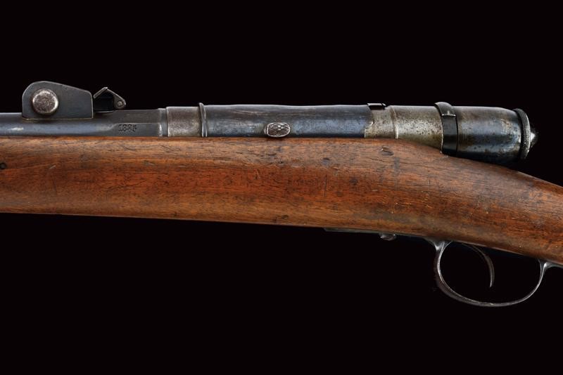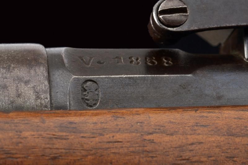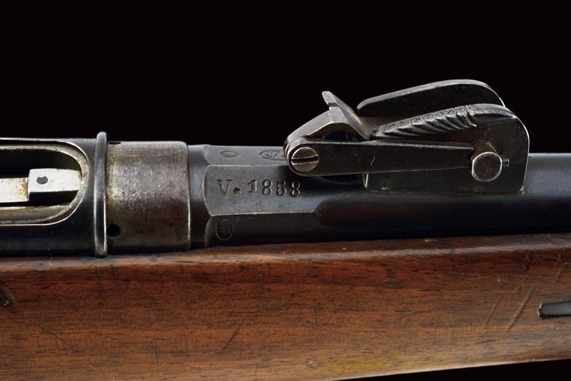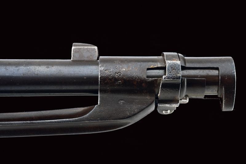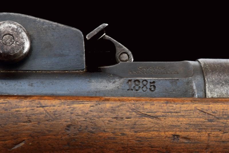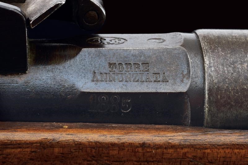 Round, rifled barrel, marked "TORRE ANNUNZIATA", "1885", "TT", with serial number "V.18xx" and crowned Savoy mark, provided with adjustable rear sight and front sight, 10.4 mm cal at the nozzle. Clean bore, well-marked rifling. Working, sliding-revolving bolt. Some external pitting. Provided with the extractor cover and with remains of antique browning. Wooden stock with coeval serial number. Iron mounts and bayonet (different serial number). Remains of antique browning. Complete with ramrod in the butt plate.