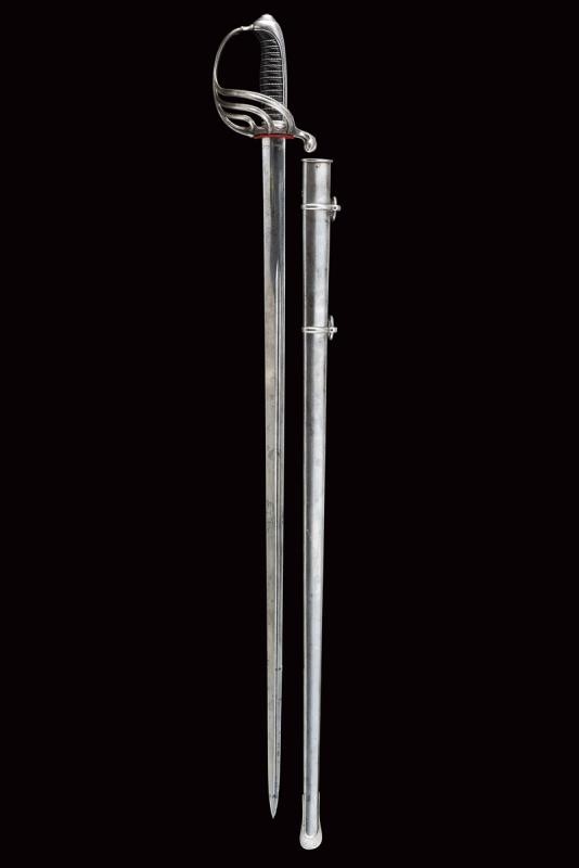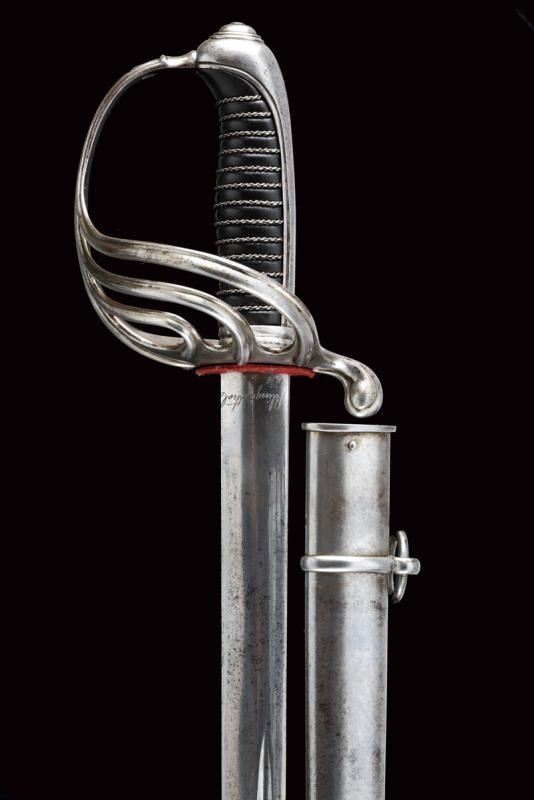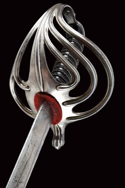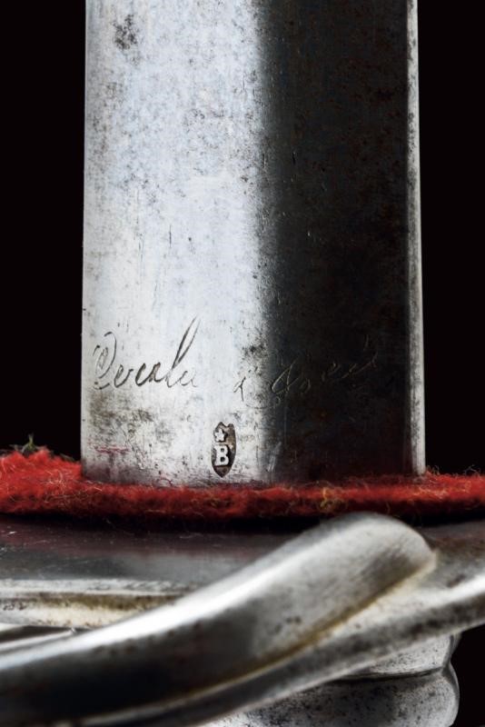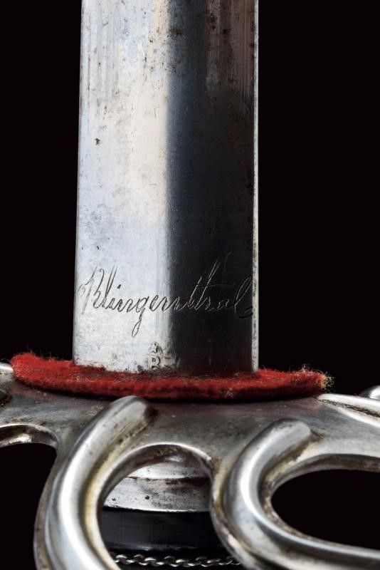 Straight blade of lenticular section, with parallel and asymmetrical fullers on both sides, featuring the mark 'Klingenthal' and a 'B' surmounted by a star on one side, and a signature in italics (not clearly legible) and the same mark on the other side. Good quality, iron hilt with lowered edges. Long cap. Horn handle with iron wire binding. Iron scabbard with two lugs.