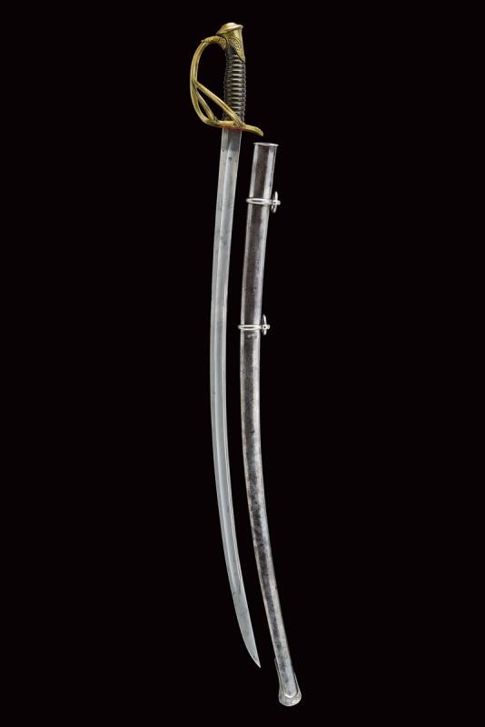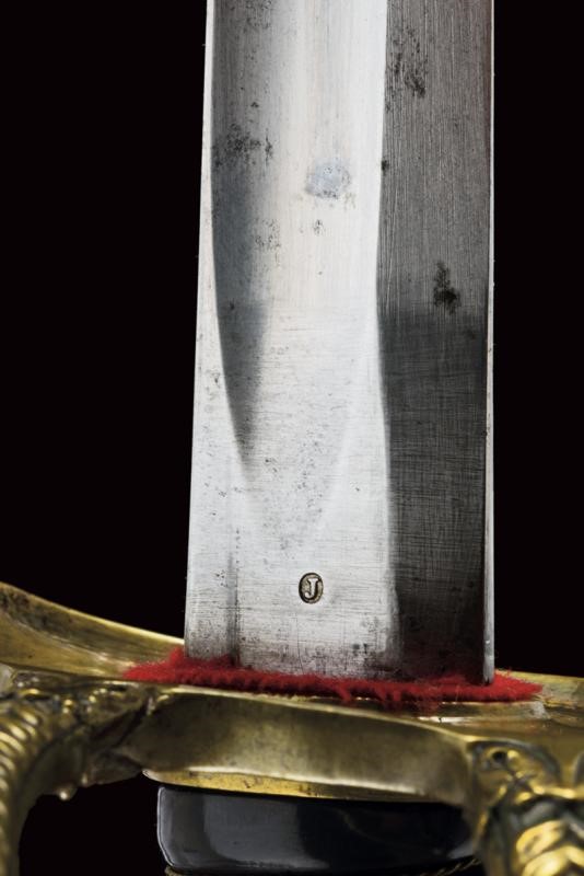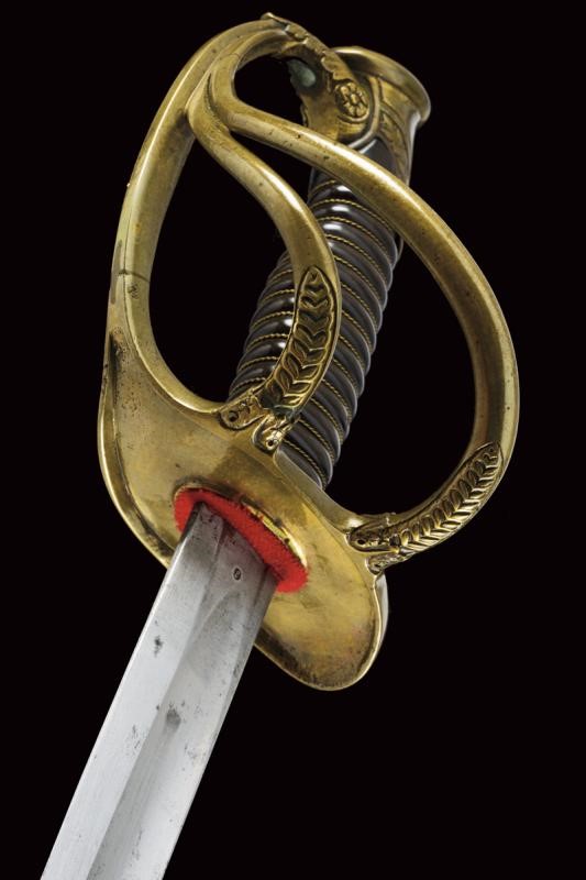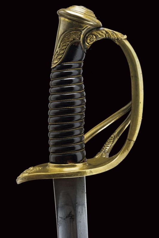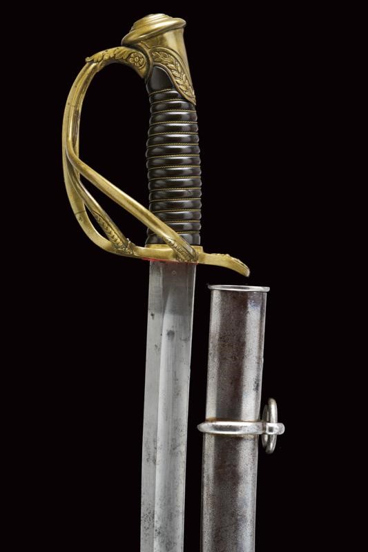 A French-style sabre. Curved, single-and short false-edged blade, with fuller over almost its entire length and with groove near the back in the middle segment, bearing a "J" mark at the base. Brass hilt with guard provided with two additional quillons, decorated with leaves in relief. Short cap with laurel fronds. Brown horn grip with brass wire binding. Iron scabbard (a few signs of use and bump) with two lugs. See a similar example in "Storia dell'Arma Bianca Italiana" by C. Calamandrei (Ed. Olimpia 1999), page 437, with photo.