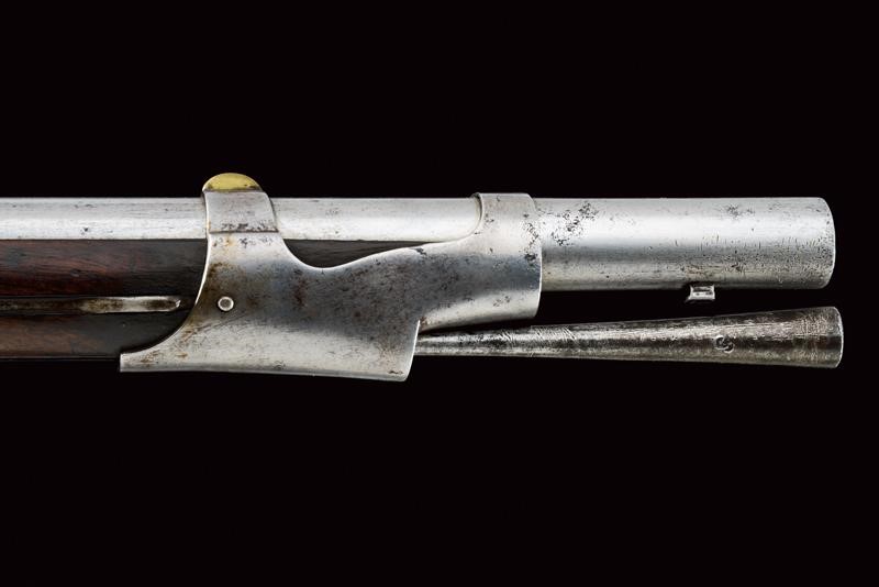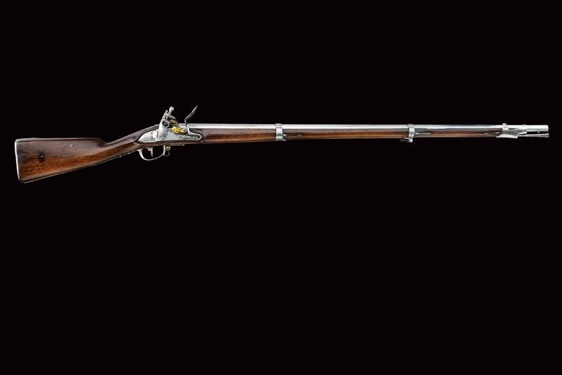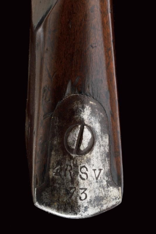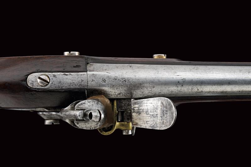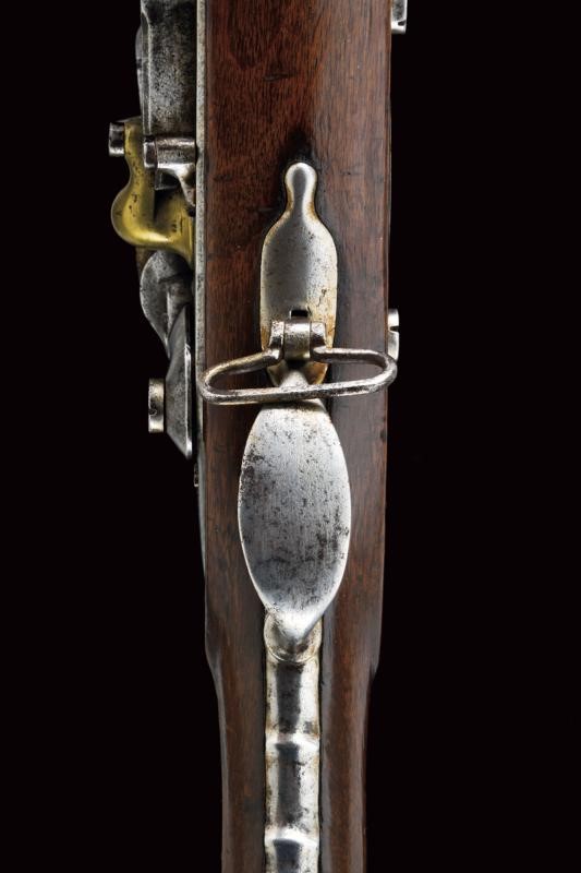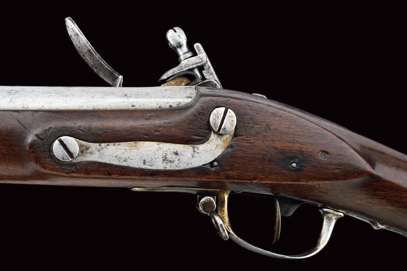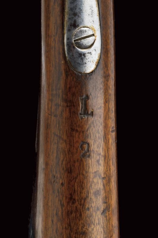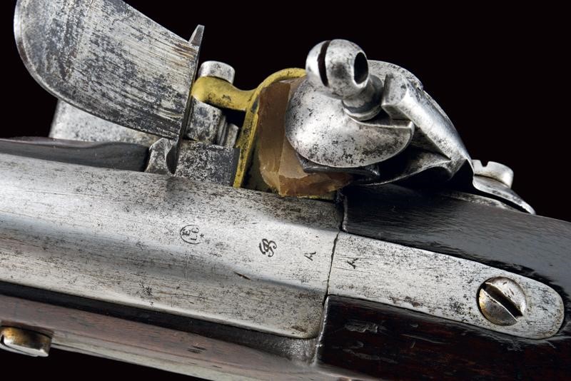 Round, smoothbore, 17.5 mm cal. barrel, octagonal at the base, provided with mark of the Liège test bench and another mark, clutch for the bayonet; flintlock with brass pan. Wooden full stock (small missing parts) marked "L2" and with serial number "2557", iron mounts and ramrod, butt plate marked "4 R SV 73" (the 4th Swiss regiment in Naples). Very rare.