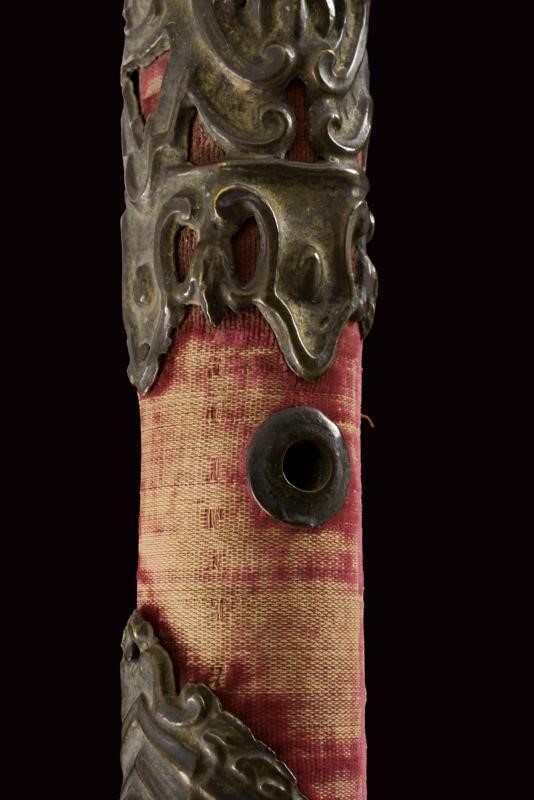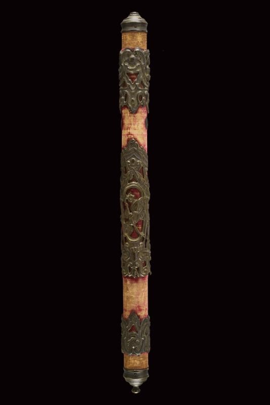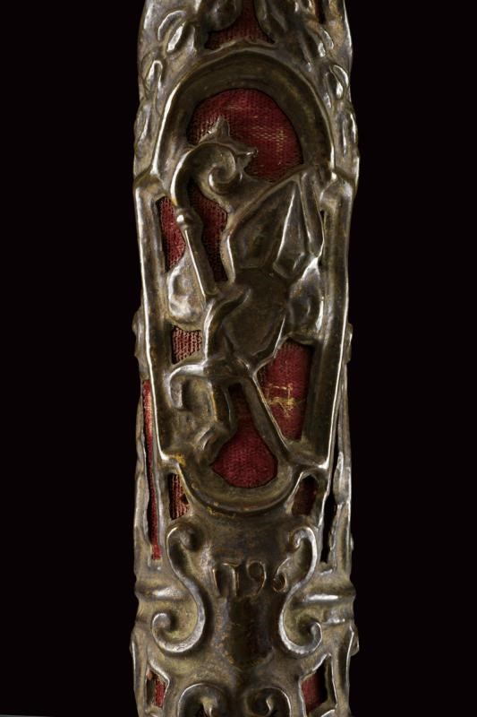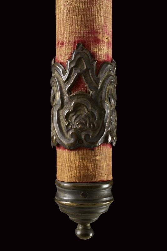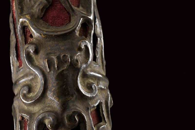 Of cylindrical shape, covered with burgundy velvet almost completely worn in the open areas but clearly visible in the openings of the embossed and partially-pierced bronze mounts. The central hilt with a bishop's baton and hat above the date '1796'. Closed edges, the lower one with a button.