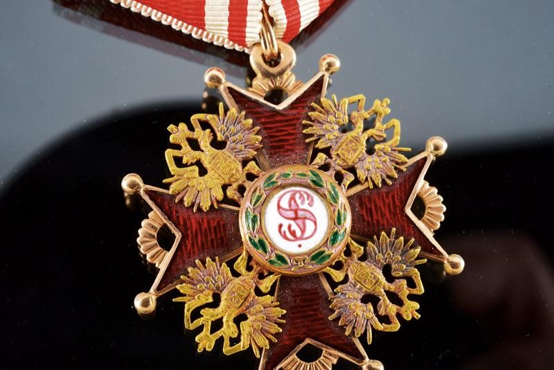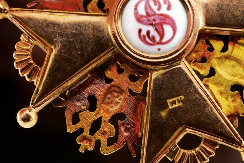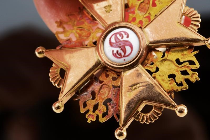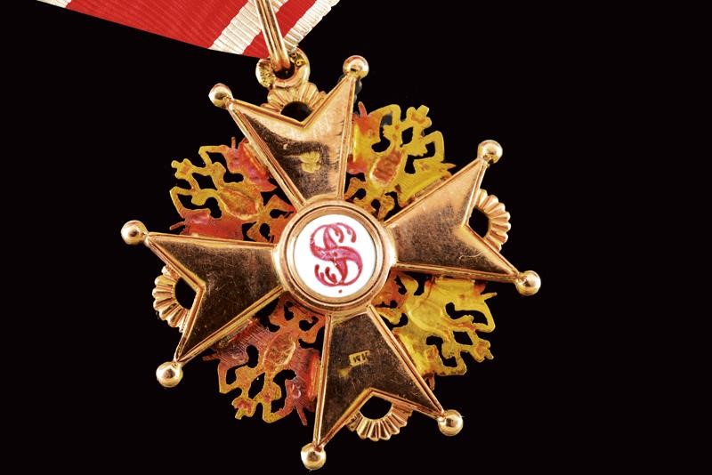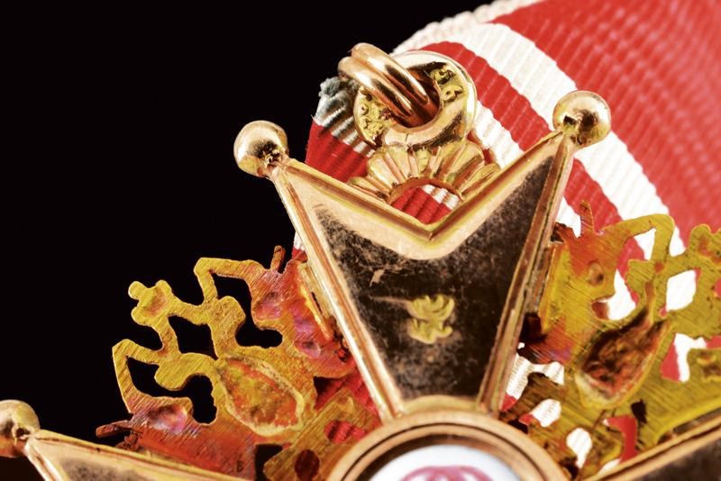 Gold and enameled, third class cross marked '56' with another mark on the ring, and 'NK', with an Imperial mark on the back. With ribbon.