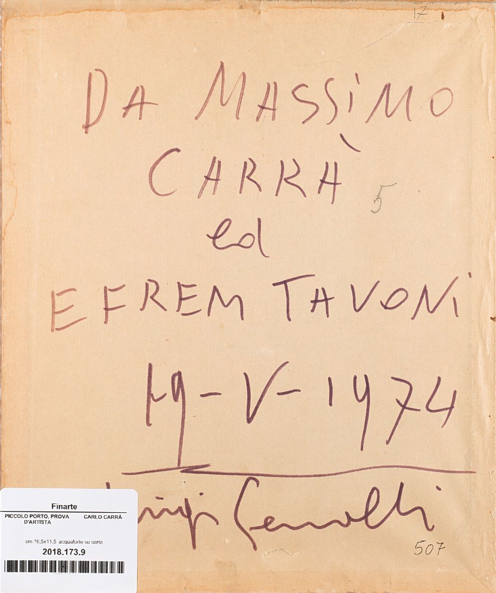 Titled and signed on the front:Prova d'artista. Piccolo Porto, Carlo Carrà