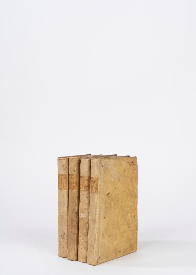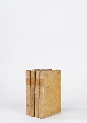 Bassano, Remondini, 1797. In 12vo. 4 volumes. Beautiful copper-engraved allegorical frontispiece to volume I, scattered foxing, contemporary parchment binding, gilt title on the spine, minor defects.