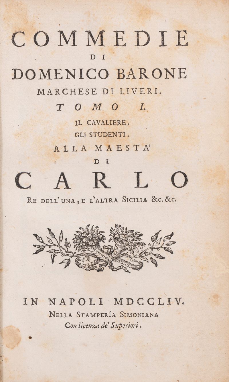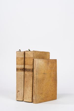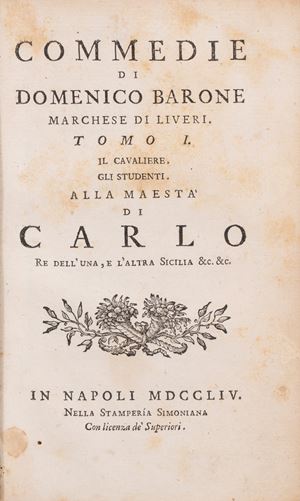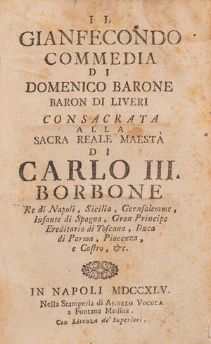 Naples, Stamperia Simoniana, 1754. In 8°. 2 volumes. Woodcut friezes, slight browning and foxing, halo in the lower corner of pp. 27-37 of vol. 1, contemporary full hard parchment binding, gilt titles on the spine, minor defects. § Together in the same lot by the same author, Il Gianfecondo Commedia, Naples, Stamperia di Angelo Vocola, 1745. Woodcut frieze on the title page, slight water stain on the upper margin, minor defects, contemporary parchment binding, handwritten title on the spine.
