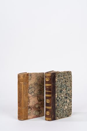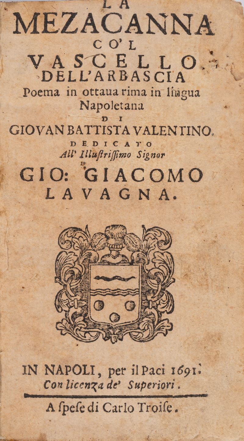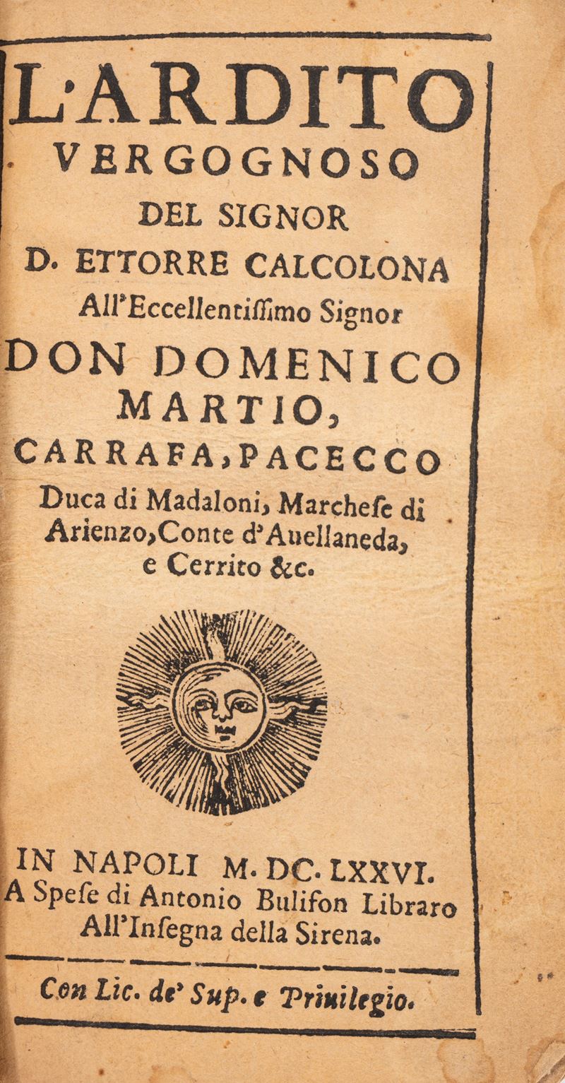 Naples, Paci, 1691. In 12°. Woodcut coat of arms on the title page, trimmed copy, partial loss of text in the top margin of the first quire, internal margin of A1 with restoration, woodworm damage on several quires, browning and light foxing, half leather and marbled paper binding, title stamped in gilt on the spine, minor defects. § Calcolona, Ettorre. L'ardito vergognoso, Naples, Antonio Bulifon, 1676. In 12°. Woodcut decorations, minor defects, contemporary half leather and marbled paper binding.