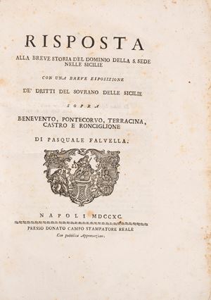 Naples, Donato Campo, 1790. In 2°. Woodcut vignette on the title page, marginal foxing, binding in full marbled parchment with title on a red leather label on the spine. § [ Stefano Borgia ]. Defense of the Temporal Dominion of the Apostolic See in the Two Sicilies in response to the writings published to the contrary . Rome, 1791. In 2°. Engraving vignette on the title page depicting a procession and a crowd of faithful gathered before St. Peter's, foxing, copy in beards, binding in half parchment and cardboard.