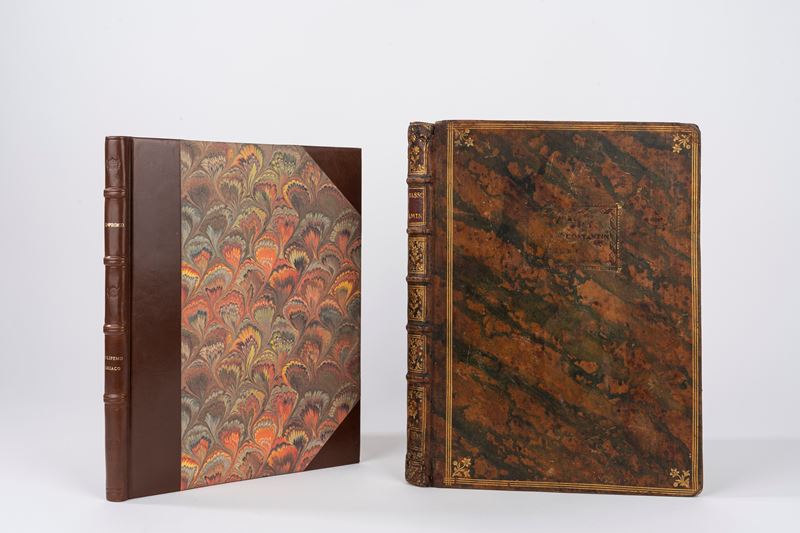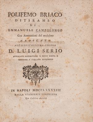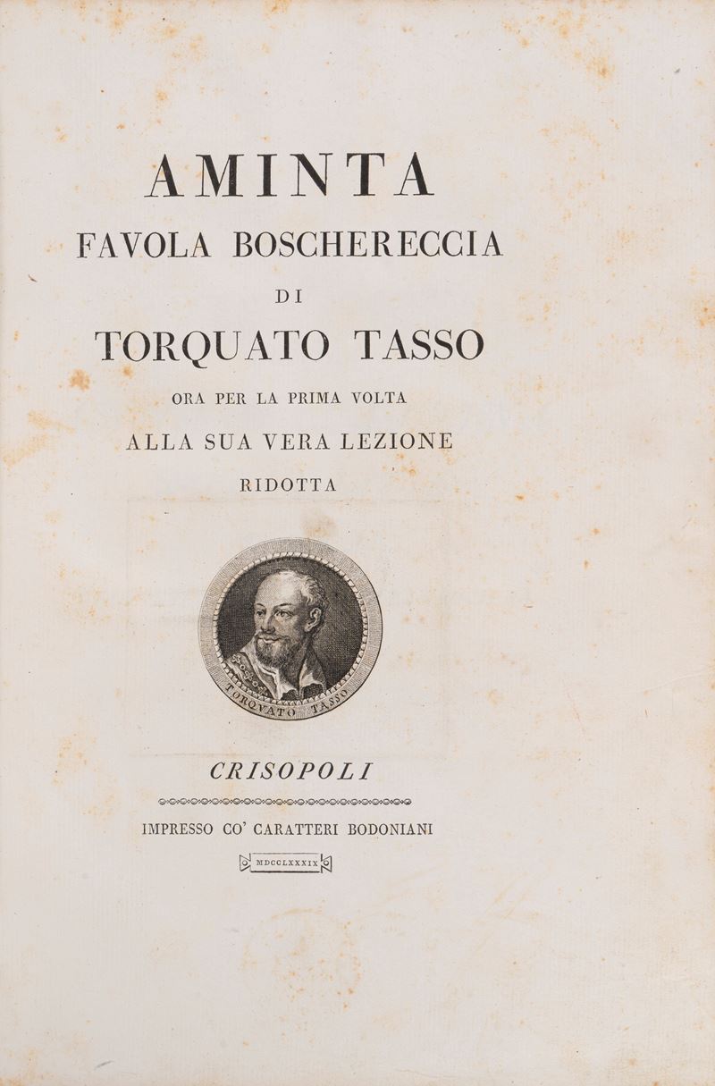 Crisopoli [ie Parma], Bodoni, 1789. In 2°. Engraving portrait of Tasso in a roundel on the title page, elegant headpiece engraved in copper by Lucatelli with the coat of arms of the dedicatee Anna Malaspina, slight foxing, contemporary marbled calf binding, boards framed with triple gilt fillet, blind-stamped on the board "SAE il Sig.r. Costantino Balbi", gold title within a red insert on the spine with 5 raised bands, gold decorations on the compartments richly decorated in gold, gilt dentelles, marbled endpapers, gilt edges, some slight defects. Traces of ownership stamp on the title page. § Campolongo, Emanuele. Polifemo Briaco Ditirambo , Naples, Stamperia Simoniana, 1793. Slight foxing, 20th century half-leather binding with corners and marbled paper, gold title on the spine.