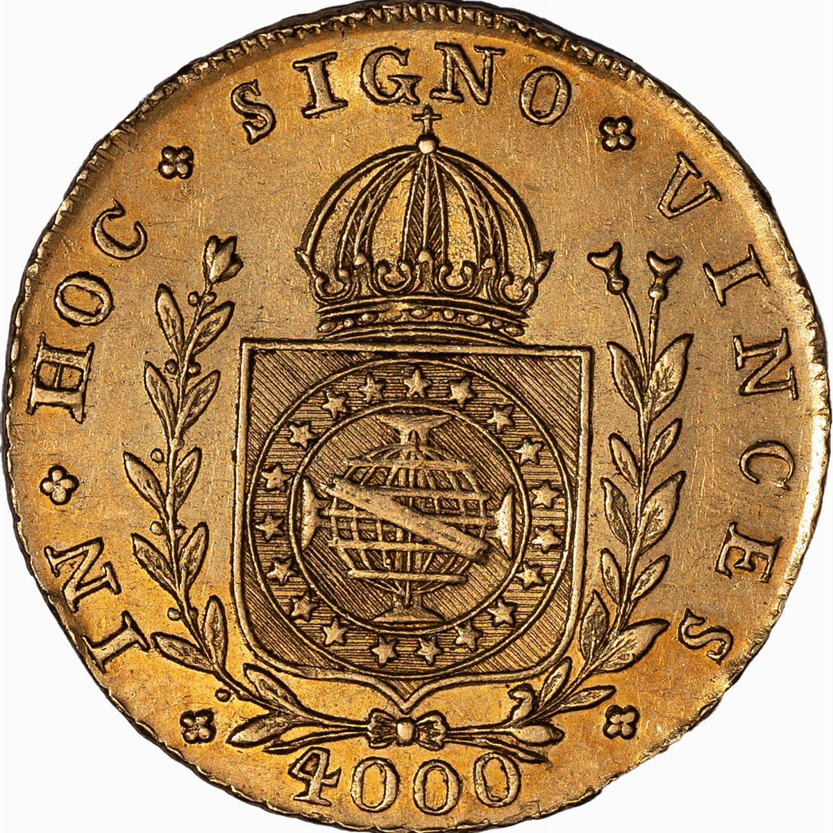 D/ effigie del sovrano a s., R/ stemma coronato fra due rami annodati alla base, Zecca di Rio de Janeiro; Metallo: AV, gr. 7,90, Diam.: mm. 26,13. BB.