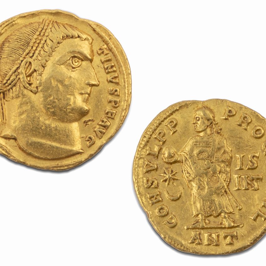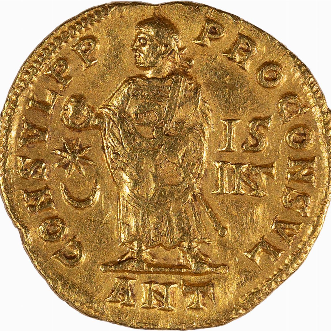 … Le raffigurazioni imperiali sulle monete di questo periodo, in particolare per quanto riguarda le zecche orientali, si riallacciano all’ espressionismo tipico delle arti figurative dell’ellenismo romano, nel quale prevalgono la grandiosità e I’effetto scenografico. Sono raffigurazioni generalmente poco in rilievo rispetto al fondo, in netta discontinuità con la ritrattistica imperiale degli anni precedenti, caratterizzata dalla presenza degli abiti militari e dall’ aspetto marziale dei busti. Tuttavia, nonostante si tratti di figure realizzate con l'enfasi massima possibile, esse si attengono ai canoni inaugurati da Diocleziano, che miravano a spersonalizzarle, privandole in gran parte dei tratti caratteristici di ognuna di esse, in linea con il profondo mutamento da lui impresso alla figura del 'imperatore, che da personaggio reale, primus inter pares e uomo fra uomini, era divenuto un semidio, chiuso nei suoi inaccessibili palazzi dorati, una sorta di elemento di raccordo fra gli uomini e gli dei.Perciò le emissioni successive alla riforma costituzionale che introdusse la Tetrarchia presentano effigi imperiali che sono un’ espressione del potere, più che non un ritratto del singolo imperatore, e sono caratterizzate da tratti impersonali di grande ieraticità, tali per cui, ad esempio, Costantino e Licinio non sono fra loro distinguibili al primo sguardo.Per quanto riguarda in particolare questa effigie di Costantino, ne risulta un ritratto massiccio, possente e ipertrofico, come dimostrano le dimensioni del collo che, per quanto potesse essere taurino nella realtà, appaiono assolutamente sproporzionate rispetto alle dimensioni della testa.L’enfasi sulla figura dell'Imperatore è ulteriormente accentuata dal fatto che il suo nome, nonostante la lunghezza, è l’unica parola non abbreviata della legenda, relativamente alla quale, può essere interessante rilevare anche la presenza degli appellativi Pivs e Felix, poiché entrambi sono caricati di un significato più ampio rispetto alle corrispondenti parole italiane. Pivs indica infatti una persona religiosa e devota, ma anche onesta, benigna e clemente. Tale appellativo, attribuito per primo ad Antonino Pio e divenuto parte integrante del suo nome, era molto ambito dagli Imperatori successivi perché ne richiamava il modello di comportamento, universalmente apprezzato. Il secondo nome, Felix, indica una persona felice perché gode del favore divino. Proprio a partire da Costantino, che liberalizzò il culto cristiano, i due appellativi acquisirono un significato sempre più coerente con la nuova religione: pio iniziò a indicare una persona devota, che sente e mostra una profonda partecipazione alle cerimonie rituali, e felice assunse il significato di colui che non è turbato da dolori o preoccupazioni perché gode cristianamente dello stato di grazia. …
