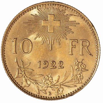 lotto composto da un esemplare da 10 franchi francesi del 1908 e da due esemplari da 10 franchi svizzeri del 1922