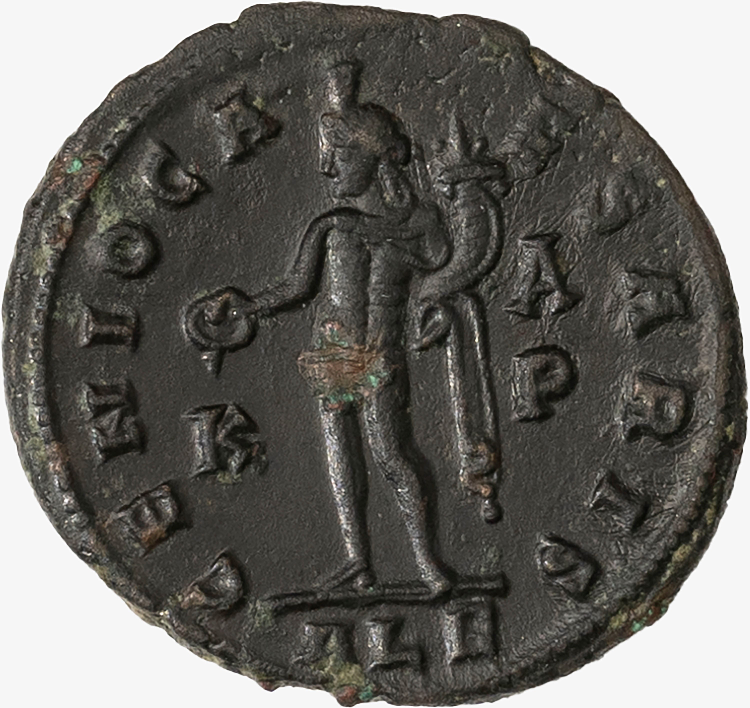 D/ busto laureato dell'Imperatore a d., R/ il Genio, nudo in piedi a s. con una clamide drappeggiata sulla spalla s., tiene una patera nella mano d. e una cornucopia nella mano s., Zecca di Alessandria; Metallo: AE, gr. 6,65, diam. 24 mm., mBB
