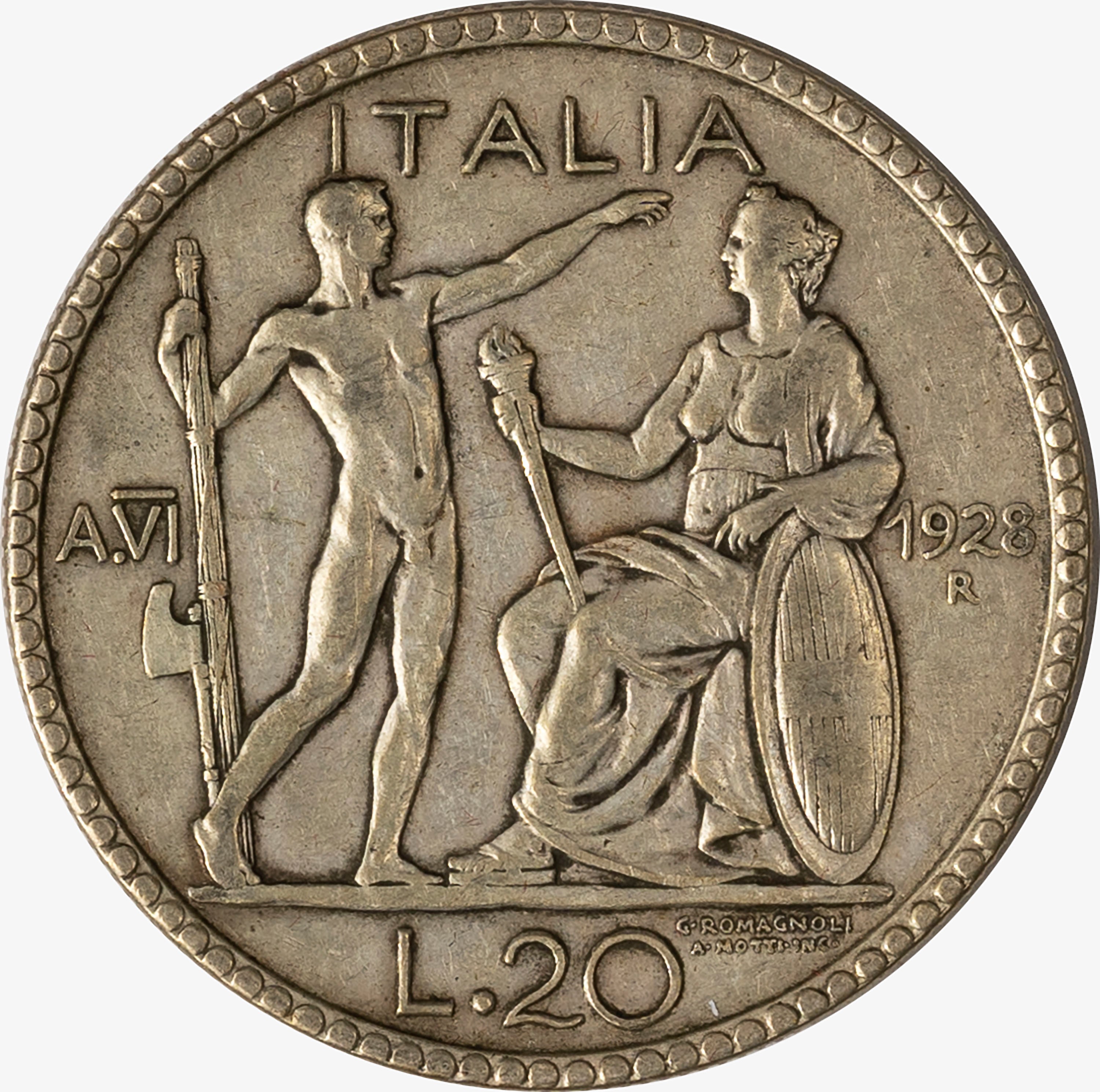D/ effigie del Re a destra R/ littore con fascio nella mano destra saluta romanamente l'Italia seduta con fiaccola e scudo sabaudo, Zecca di Roma; Metallo: AR. qBB