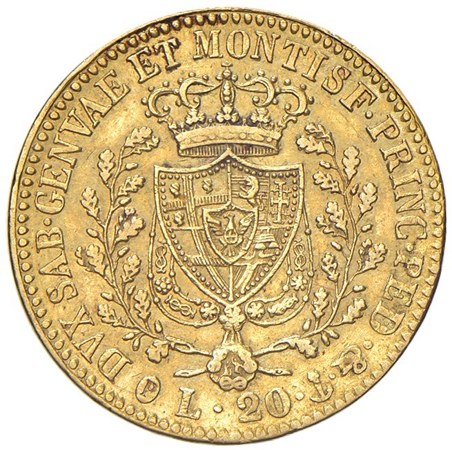 D/ effigie del Re a s. R/ stemma di Casa Savoia coronato e ornato dal Collare dell'Annunziata, Zecca di Genova, Rif. bibl. Montenegro 46, Metallo: AV, gr. 6,40. BB