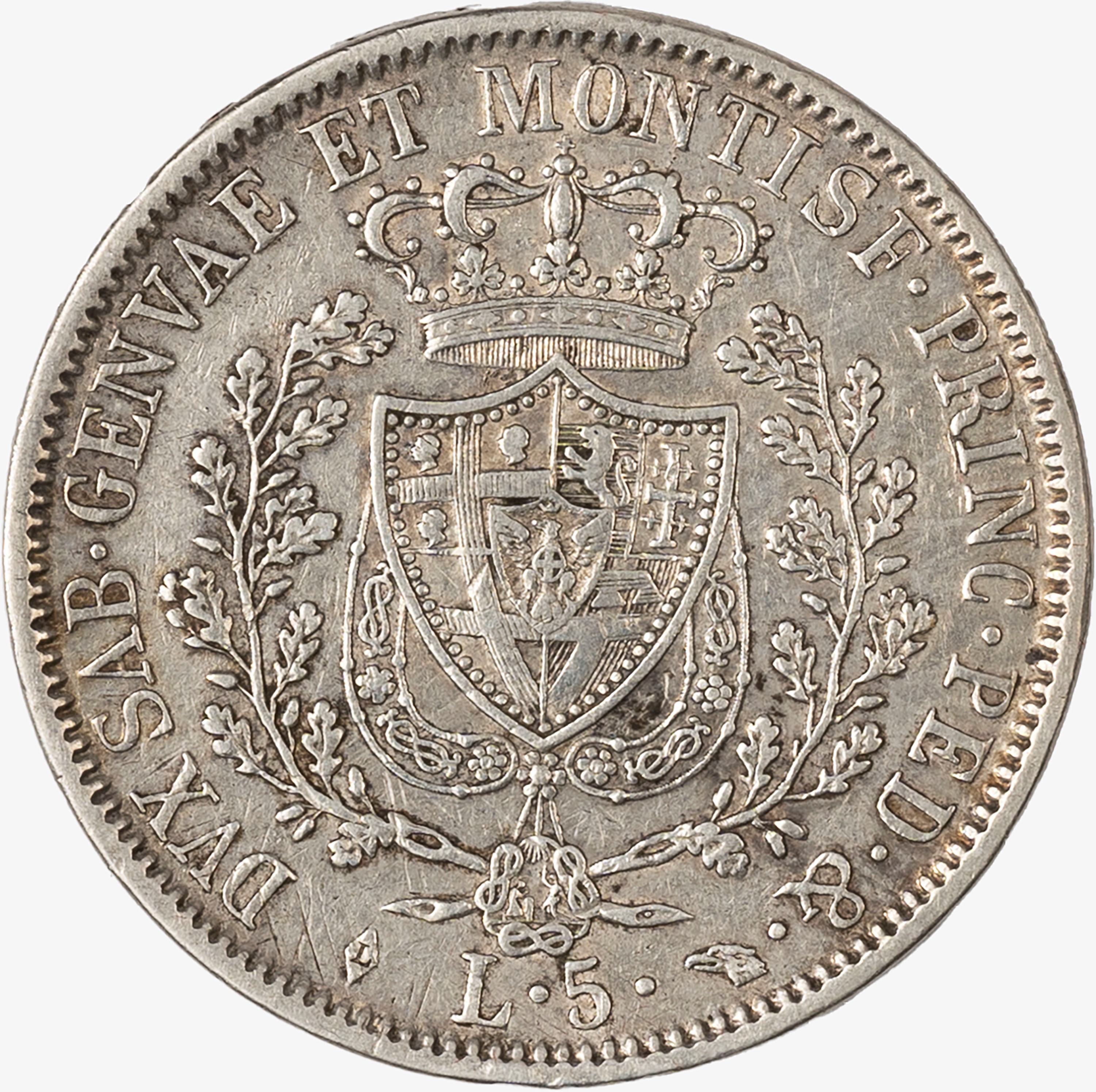 D/ effigie del Re a destra R/ stemma di Casa Savoia coronato e ornato dal Collare dell'Annunziata; Metallo: AR. qBB