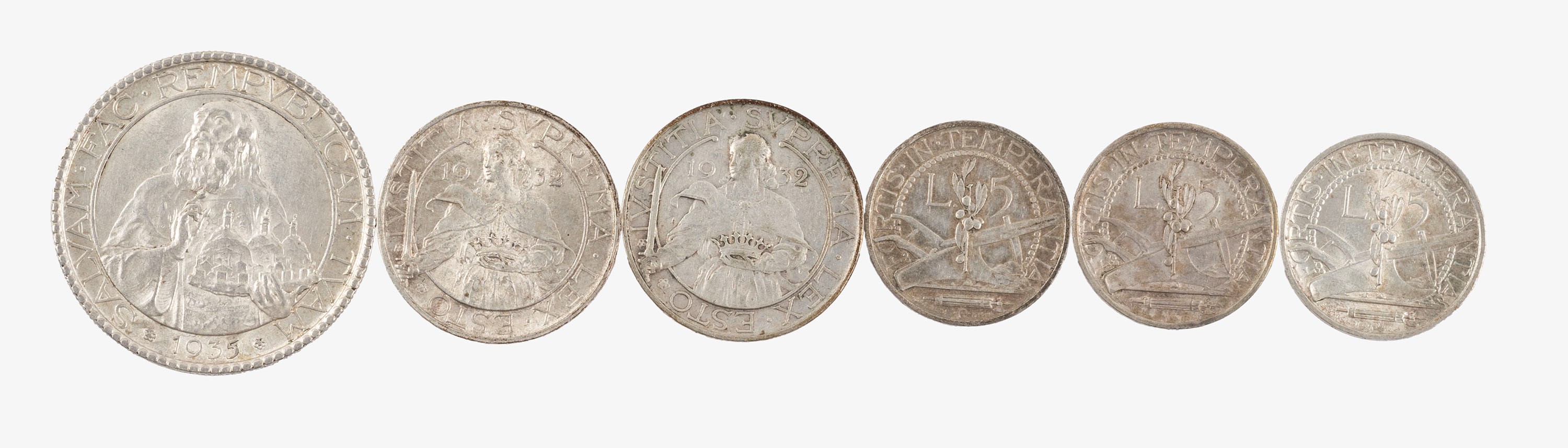 Lotto composto da: un 20 Lire 1935, 2 esemplari da 10 Lire 1932, un esemplare da 5 Lire 1933 e 2 esemplari da 5 Lire 1935, Zecca di Roma; Metallo: AR. BB