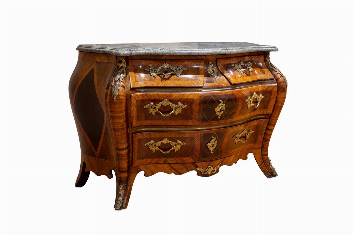 Con la sua accentuata bombatura, gli angoli arrotondati, i legni dai colori contrastanti e i fianchi fortemente mossi, questa commode si avvicina molto alle creazioni di Johan Neijber e di suo fratello Ludwig, famosi ebanisti nella Svezia della metà del Settecento, che ebbero tra i loro committenti anche il Re Gustavo III.