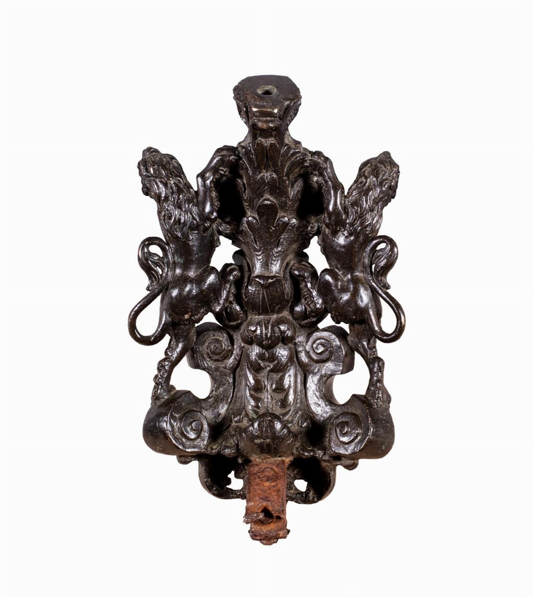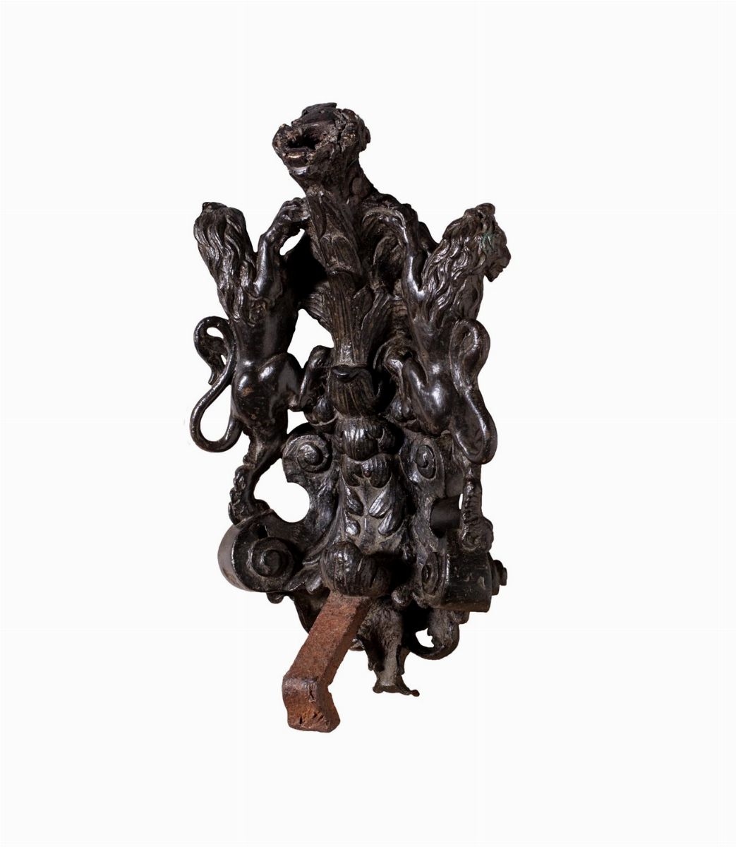 con leoni rampanti retrospicienti poggiati su struttura a ricci e volute; in basso cherubino frontale, in alto cartella araldica con il Leone di San Marco. Sul retro volute e motivi vegetali a foglie d'acanto.