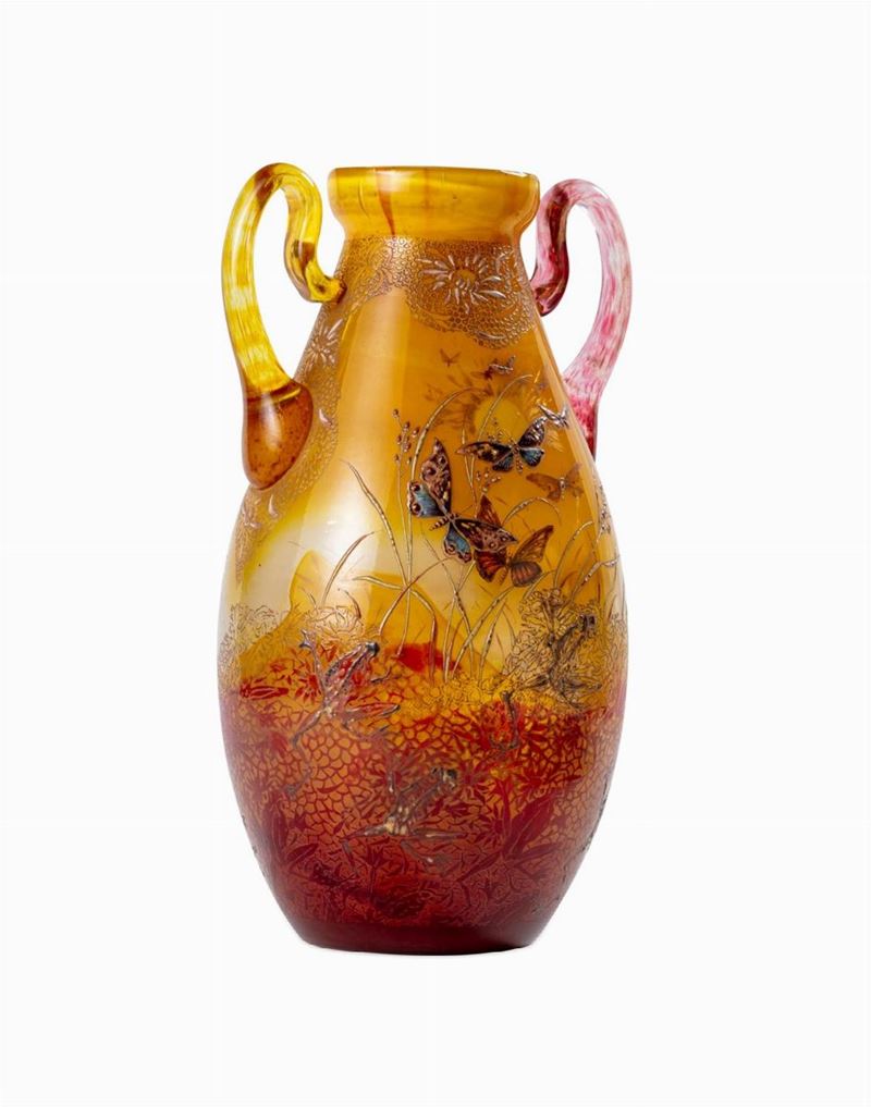 Two handled vases in blown glass, with polychrome enamels depicting leaves, flowers and butterflies, France early 20th century