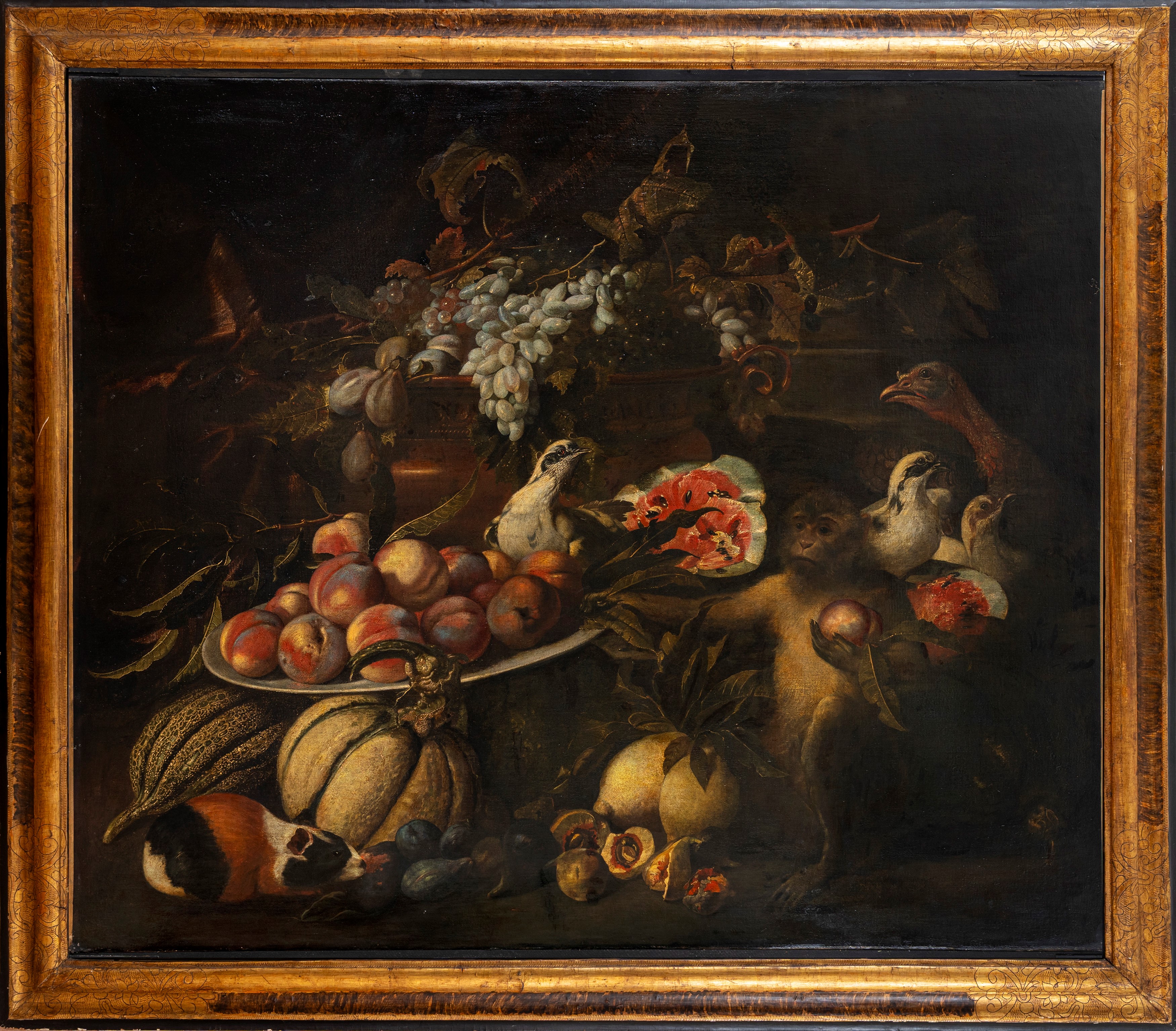 Still life of fruit with monkey, guinea pig and birds