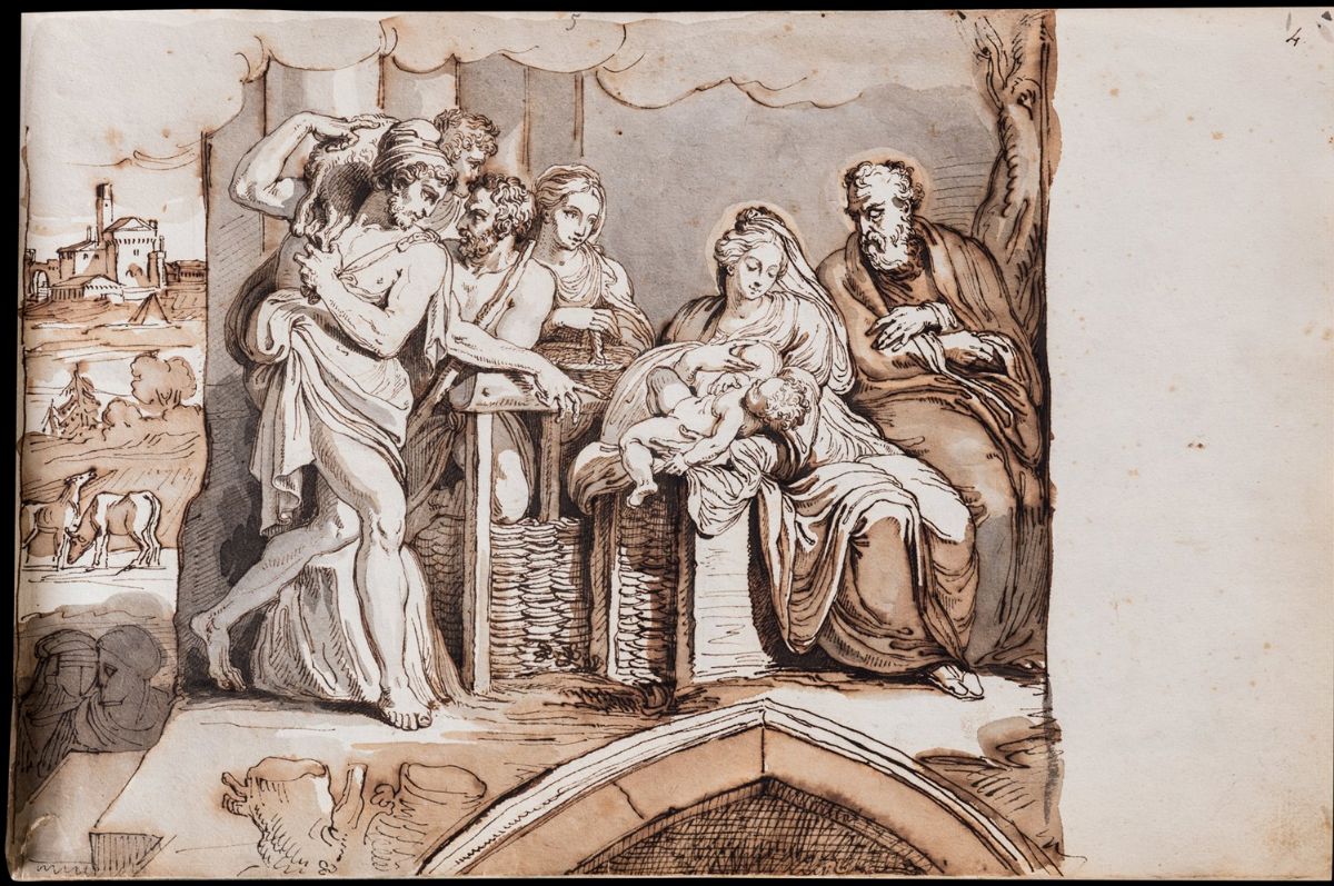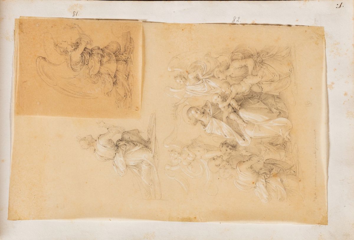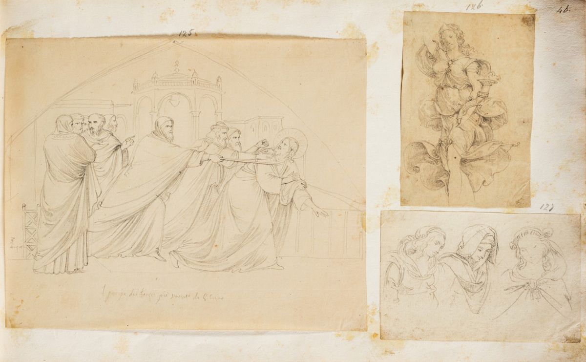 L’album si presenta come una raccolta di disegni di Tommaso Minardi, tredici sono vergati sui fogli dell’album stesso (cc. 1-12; 58), gli altri sono stati incollati a posteriori. La duplice genesi di questa raccolta è testimoniata dalla presenza di una doppia numerazione: una prima, caratterizzata da numeri apposti con inchiostro bruno in alto a destra sul recto di ogni foglio, e una seconda che numera a matita i singoli disegni. I tredici fogli utilizzati come supporto per il disegno dimostrano che l’album fu utilizzato da Minardi come taccuino nella sua fase giovanile. Oltre alla compatibilità stilistica con i fogli noti dell’artista, i disegni rivelano infatti una coincidenza con gli spostamenti attestati dalla sua biografia (G. De Sanctis, Tommaso Minardi e il suo tempo, Roma 1900; Tommaso Minardi: disegni, taccuini, lettere nelle collezioni pubbliche di Forlì e Faenza, a cura di M. Manfrini Orlandi e A. Scarlini, Bologna 1981; Disegni di Tommaso Minardi 1787-1871, catalogo della mostra a cura di S. Susinno, 2 voll., Roma 1982). Nella raccolta figura una copia dalla Disputa sull’incoronazione della Vergine di Jacopo Bertucci, conservata nella Pinacoteca della natia Faenza, e copie da opere bolognesi, talvolta accompagnate dalla scritta “TM Bologna 1808”, così come accade nella Scuola di matematica oggi conservata alla Galleria Nazionale d’Arte Moderna di Roma (Disegni… 1982, p. 138, cat. 18). Sempre fra quelli direttamente disegnati sull’album spicca una bellissima Adorazione dei pastori, tratta dai perduti affreschi di Nicolò dell’Abate in Palazzo Leoni a Bologna (Fogli della follia. Fortunato Duranti, visionario e romantico, a cura di A. Giovanardi, Rimini 2018, p. 48). Nelle pagine lasciate vuote dal maestro è stata in un secondo momento operata una collazione di disegni attribuibili a lui in grandissima parte. Si tratta di un’operazione attenta e coerente, poiché riunisce soprattutto studi realizzati nel medesimo contesto in cui era stato utilizzato il taccuino: alla c. 30 si trova, ad esempio, di nuovo l’indicazione “Bologna 16 apr.le 1808”, mentre altre copie risultano probabilmente eseguite sulla base di incisioni molto diffuse in ambito bolognese (copie da Correggio, Raffaello e Giulio Romano). In generale la maggior parte degli schizzi è realizzata durante i soggiorni giovanili dell’artista nell’Italia centro-settentrionale tra il 1808 e il 1812 (Disegni…1982, pp. 73-76). Compaiono infatti studi tratti da opere milanesi (il Cenacolo leonardesco), ravennati (dai mosaici di Sant’Apollinare Nuovo, ma anche dal ciclo di scuola giottesca di Santa Maria in Porto Fuori), senesi (è noto che i suoi disegni dal pergamo di Nicola Pisano illustrarono la Storia della scultura di Leopoldo Cicognara, edita tra il 1813 e il 1818). In numero minore compaiono poi schizzi riferibili a un momento più maturo, come attesta la presenza di opere romane. L’autografia dei disegni può dunque essere stabilita sia su base stilistica, sia per via del riuso fatto dall’artista di fogli precedentemente utilizzati per la corrispondenza, che riportano il suo nome e infine grazie al confronto delle filigrane con quelle rintracciate nelle carte dell’archivio personale di Minardi, conservato presso l’Archivio di Stato di Roma. Non ascrivibili alla mano di Minardi sono le varie composizioni floreali, lo schizzo di figure distese (c. 59v), il ritratto di uomo a pastello (c. 14v) e questo attesta che la collazione dell’album si deve alla mano di un attento collezionista e non al maestro stesso che era solito viceversa raccogliere gli album dei propri disegni dividendoli per soggetti (S. Ventra, Disegni di Tommaso Minardi in Accademia di San Luca. Il legato testamentario e altre acquisizioni, in "Horti Hesperidum", 1, 2014, pp- 303-350). La raccolta è un’opera di grande valore perché documenta la selezione dei modelli in fase giovanile da parte di Minardi e la formazione di un gusto che privilegia la produzione artistica del Tre e Quattrocento che si consoliderà nella cultura del maestro fino all’adesione al purismo e che coinvolgerà molti protagonisti del panorama artistico e culturale ottocentesco in Italia (S. Ricci, Agli albori del purismo: il riflesso degli "antichi maestri" nell’opera del giovane Tommaso Minardi, in La ricerca giovane in cammino per l’arte, a cura di C. Bordino - R. Dinoia, Roma 2012, pp. 241-261). Stefania Ventra