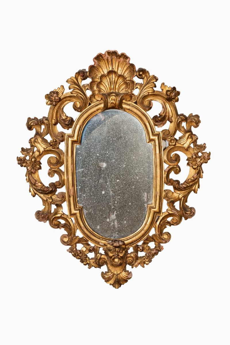 Due specchiere in legno intagliato e dorato con motivi a volute floreali, mascherone e cimasa a forma di conchiglia