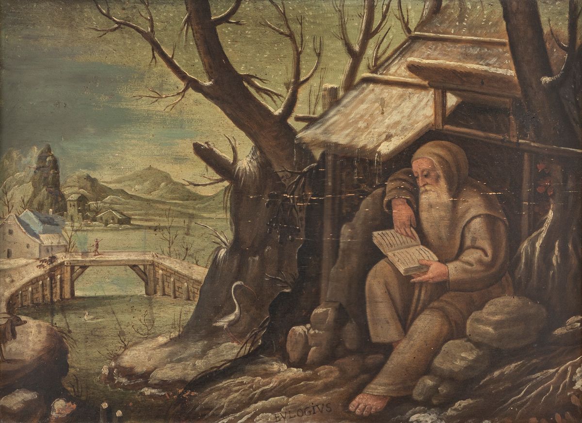 The painting is inspired by the series of prints Solitudo sive vitae patrum eremicolarum, engraved between 1585 and 1586 by Jan Sadeler the Elder (1550 - 1600) on invention of Marten de Vos (1532-1603 or 1604).