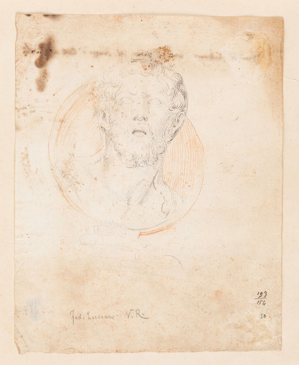 on the back, above, ancient inscription in pen and ink partially readable: Head of Meleager in (.. .) Tivoli ; on the back, at bottom, partially readable pencil inscription: Al palazzo d'Este a Tivoli (...)/ Fed. Zuccaro che fu anche scultore (...)/ Ancona 1542/1609 / Girol. Muziano (...) Brescia / 1528/1592.