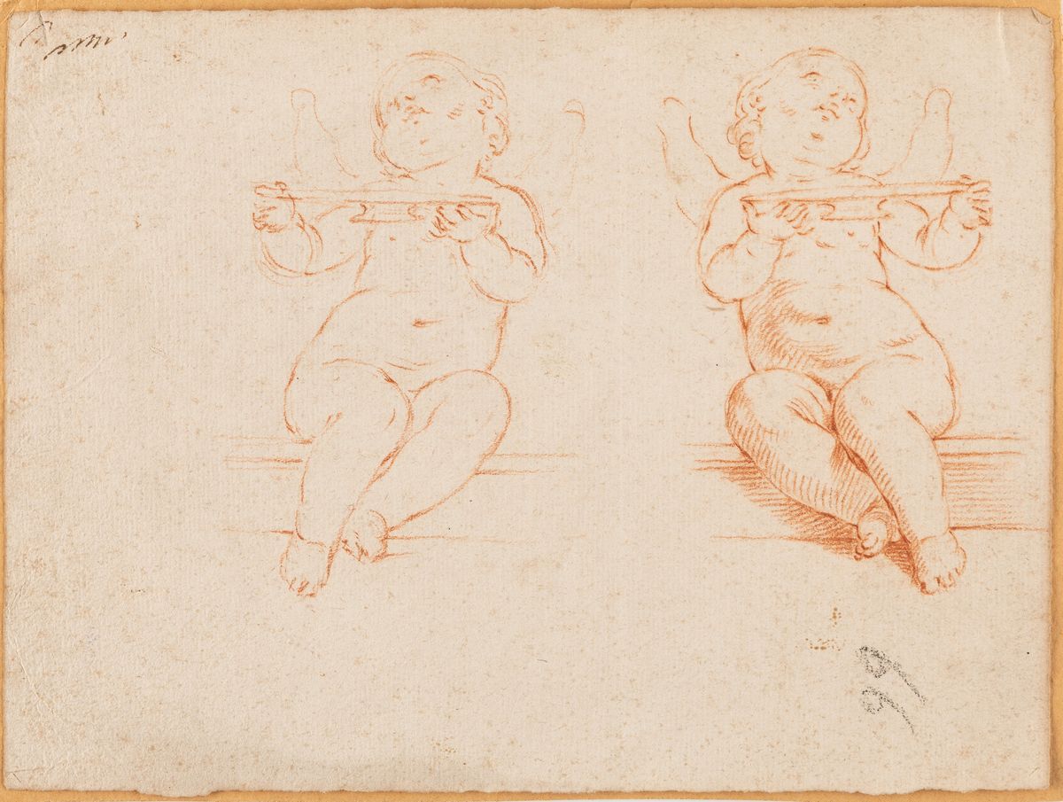 A) Emilian school, 18th century, Study of two cherubs , red chalk on paper with watermark "Letters CFP surmounted by a lily", 168 x 228 mm