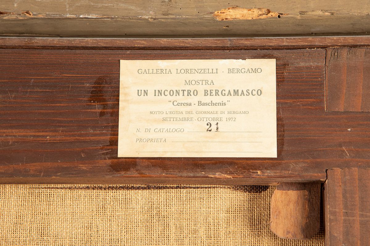 on the back, on the frame, label of provenance: Galleria Lorenzelli - Bergamo / Mostra / Un incontro bergamasco / Ceresa - Baschenis / Sotto l'egida del giornale di Bergamo / Settembre - Ottobre 1972 / N. di catalogo 2