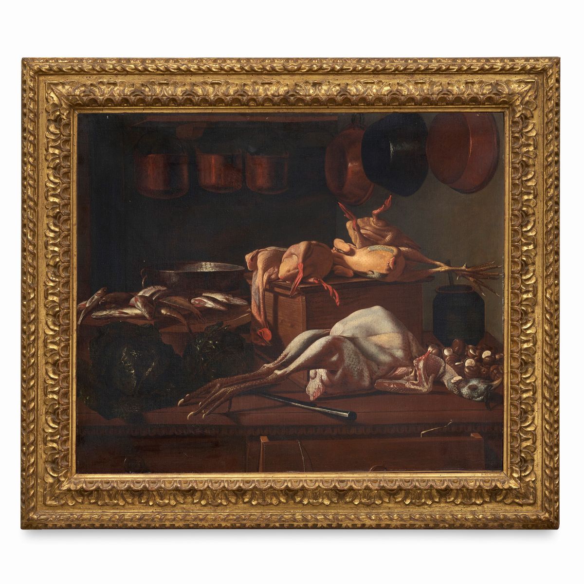 La composizione, della quale si conoscono più versioni autografe e di bottega, è una variante del celebre dipinto Natura morta di cucina con piuma (Bergamo, collezione privata), ritenuto il prototipo e considerato il capolavoro assoluto del genere delle Cucine, ideato proprio da Baschenis (E. De Pascale, in Evaristo Baschenis e la natura morta in Europa, catalogo della mostra, Bergamo, Galleria d'Arte Moderna e Contemporanea, 4 ottobre 1996-12 gennaio 1997, Milano 1996, cat. 17 p. 170-171). Il dipinto offerto nel lotto, inedito, si differenzia dalle altre versioni, note in bibliografia, per la presenza delle pentole in alto sullo sfondo, disposte in diagonale su due pareti, che accentuano la spazialità della scena, in cui i corpi senza vita dei volatili e dei pesci sono posati su piani visivi differenti a creare un dinamismo che contrasta con la rigidità della morte, resa in modo brutale ma dal forte effetto teatrale. La composizione è scandita da fasci di luce e contrasti chiaroscurali, tipici di Baschenis, che indagano le superfici, restituendo con perfetto verismo la diversità della materia (la pelle rugosa dei volatili e quella viscida dei pesci, la lucidità del rame, le venature del legno) ma, al tempo stesso, creando un'atmosfera metafisica di sospensione temporale.