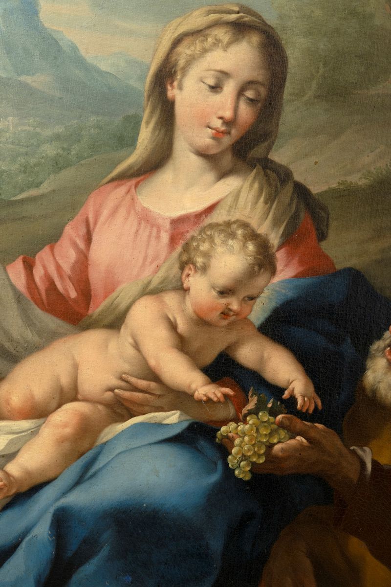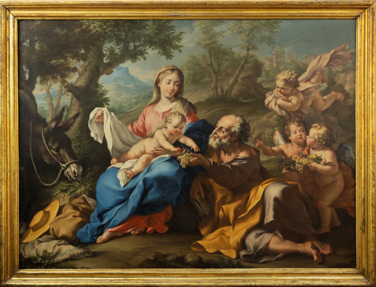 Il pittore lavorò a Napoli dal 1733, dove dipinse per la Chiesa dei Gerolamini, per l'Abbazia di Montevergine e per la Chiesa della Nunziatella. Durante il suo soggiorno partenopeo ebbe modo di studiare le opere di Solimena, De Matteis e De Mura, da cui fu fortemente influenzato, sia per la gamma cromatica, sia per la plasticità delle figure. Tutte queste caratteristiche si ritrovano nel dipinto qui offerto, di grande impatto visivo, in cui la dolcezza della scena familiare, inserita in un paesaggio arcadico, pur nella grazia dei colori, è resa con attenzione ai dettagli naturalistici e con un'umana adesione agli affetti quotidiani.